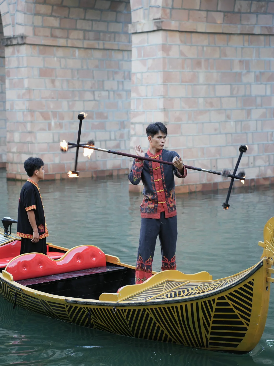 🧡火舞秀,热情奔放 —— 夜幕降临,火舞秀拉开帷幕。舞者们手持火把,随着节奏舞动,火光在夜空中划出一道道美丽的弧线。每一次旋转,都充满力量与激情,将夜晚的威尼斯风情点缀得更加璀璨夺目。