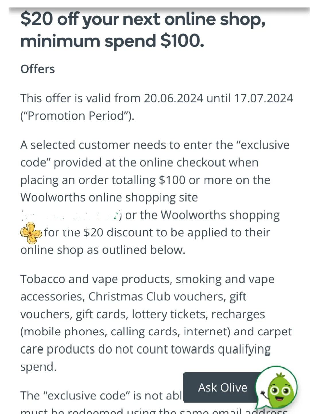 绿超市现在有线上购物🈵100➖$20折扣优惠活动[哇R] [探店R]活动有效期为2024年6月20日至7月17日 [清单R]在Woolworths在线购物或Woolworths购物app上完成订单总额为$100或以上的订单时,需要在在线结账时输入提供的“专属代码”,才能获得$20折扣! [向右R]此优惠券仅适用于在线购物,不适用于实体店购物。 [烟花R]促销代码“WELCOMEBACK20” 关注我,下一篇更精彩