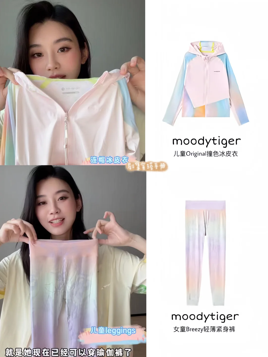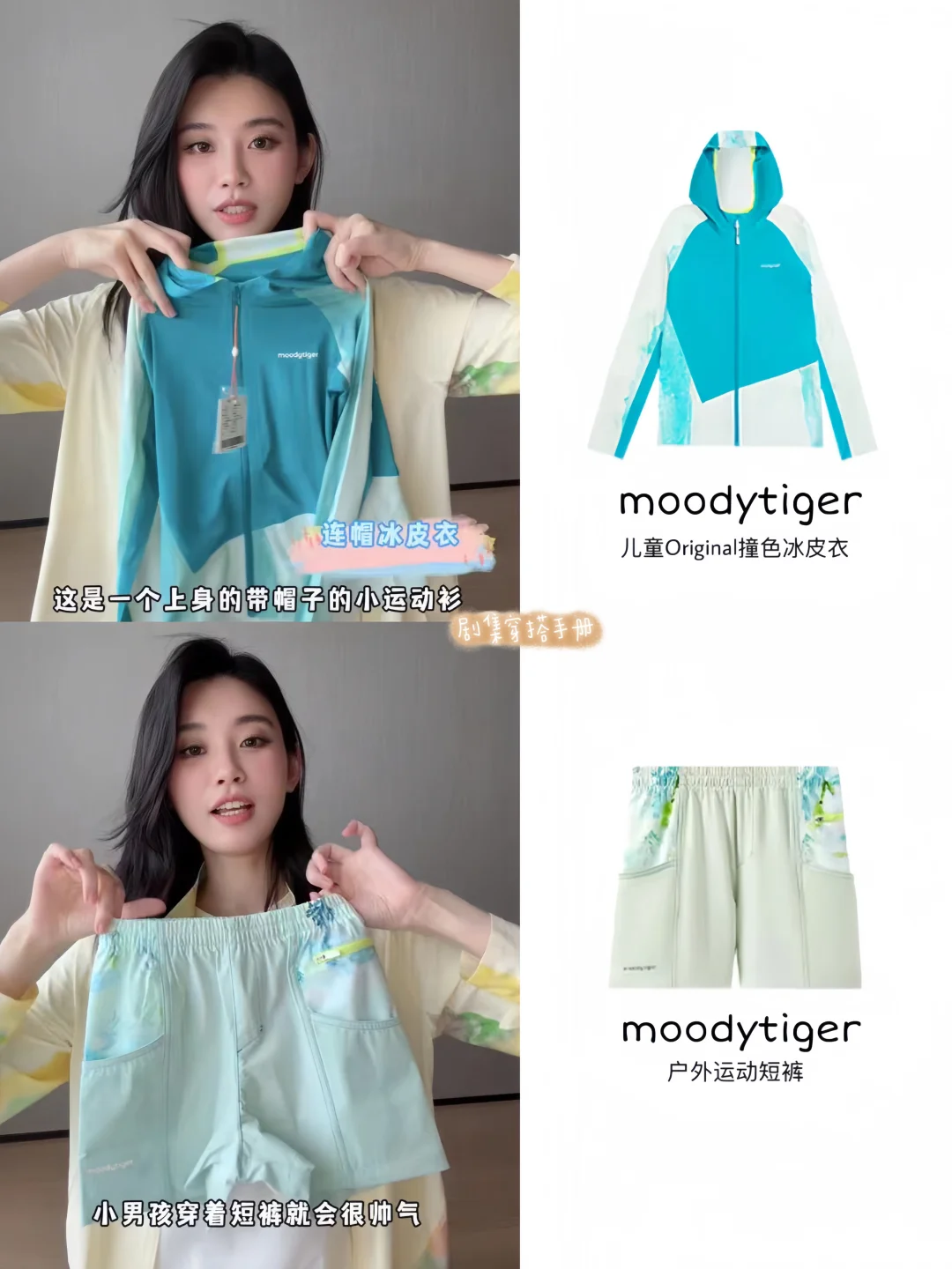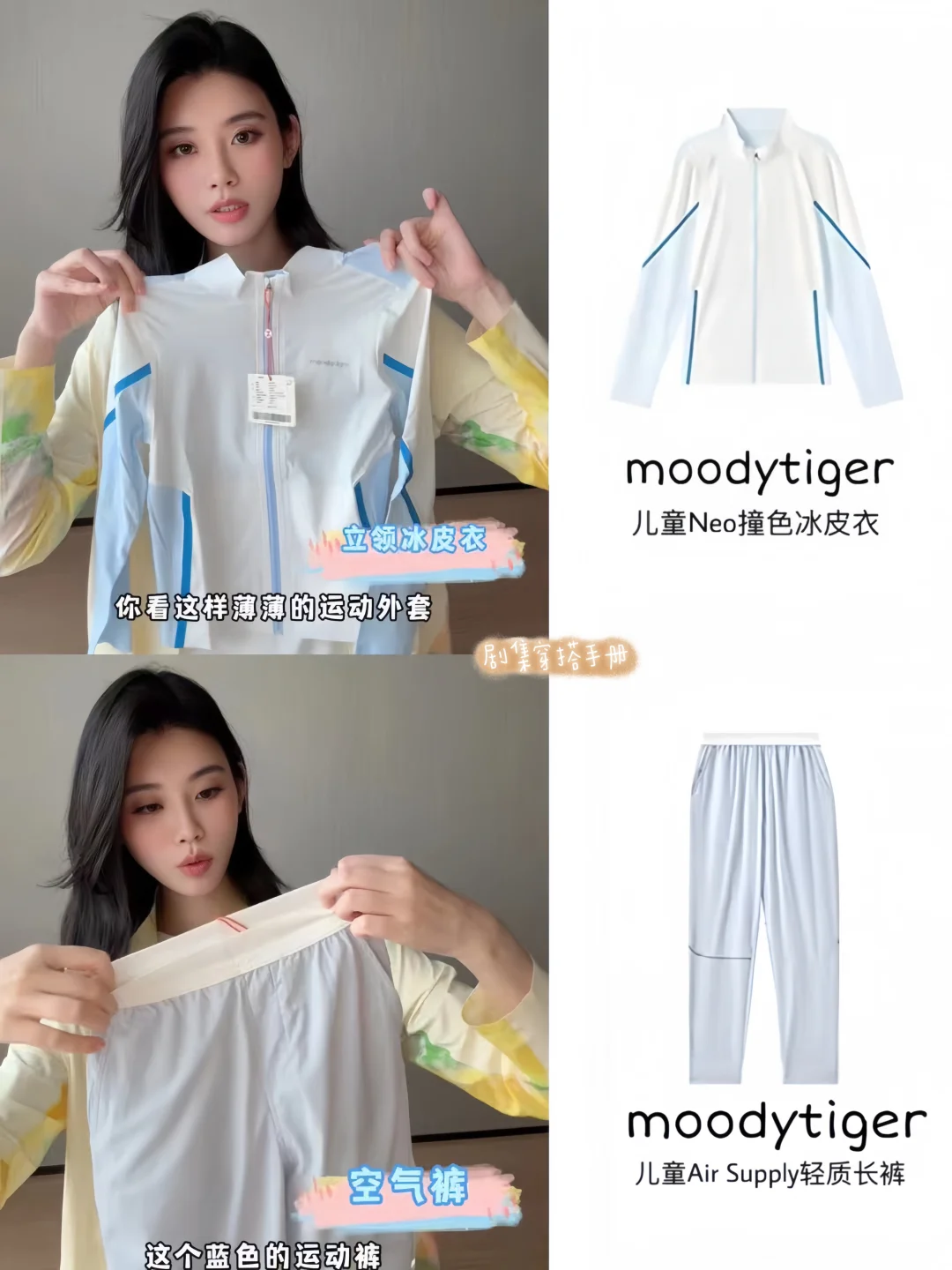 ✨奚梦瑶还介绍了不少给小朋友选的运动装,多巴胺的配色很亮眼,很适合夏天给小朋友穿上。moodytiger家很火的冰皮防晒衣是奚梦瑶很喜欢的款,她提到这款冰皮衣上身后特别薄特别滑,体感很不错,尺码选择很多,非常适合当亲子装,漂亮又实穿。有可爱的短裙,也有小朋友也可以穿的leggings,让小朋友运动时也可以很时髦。