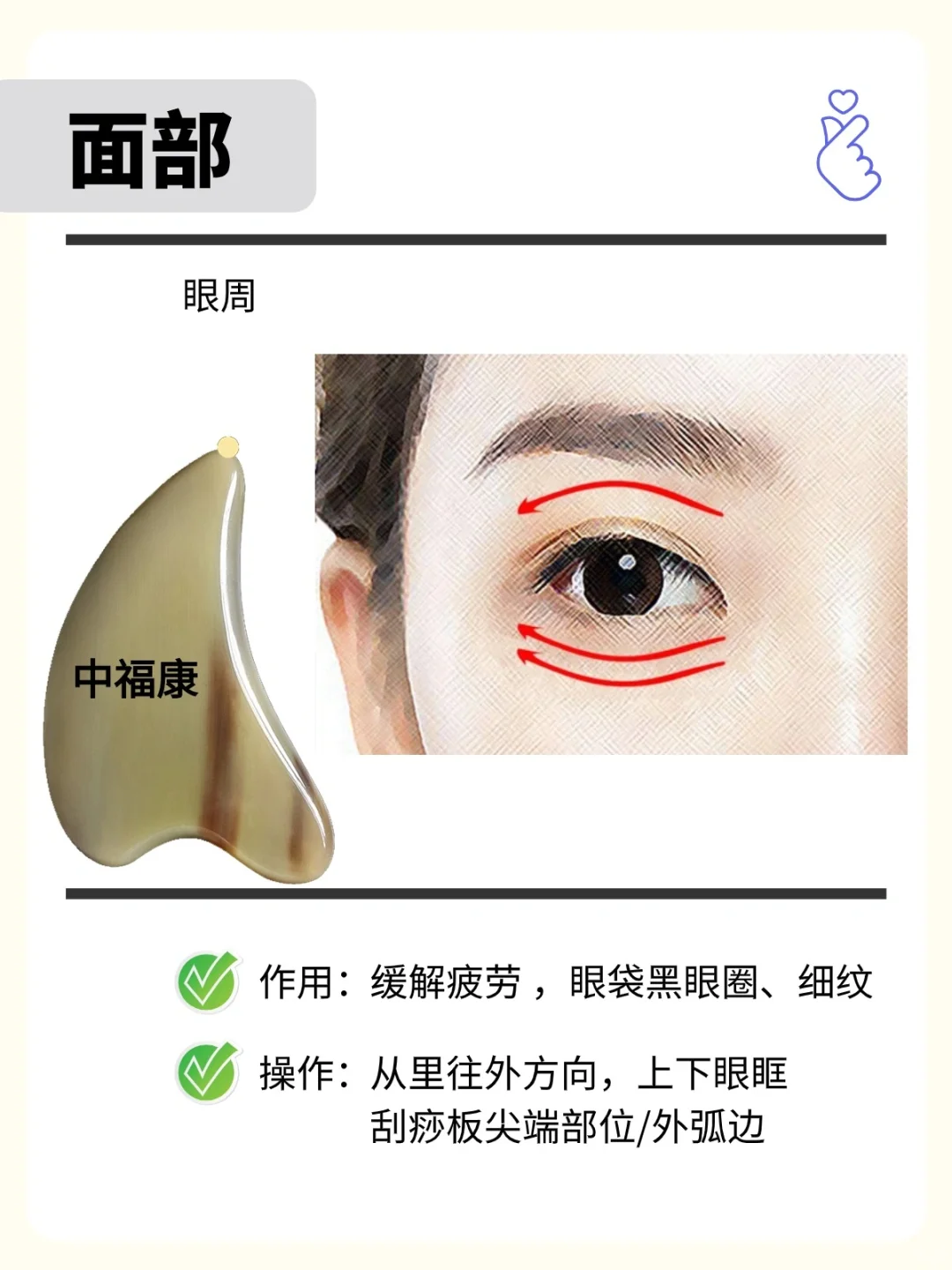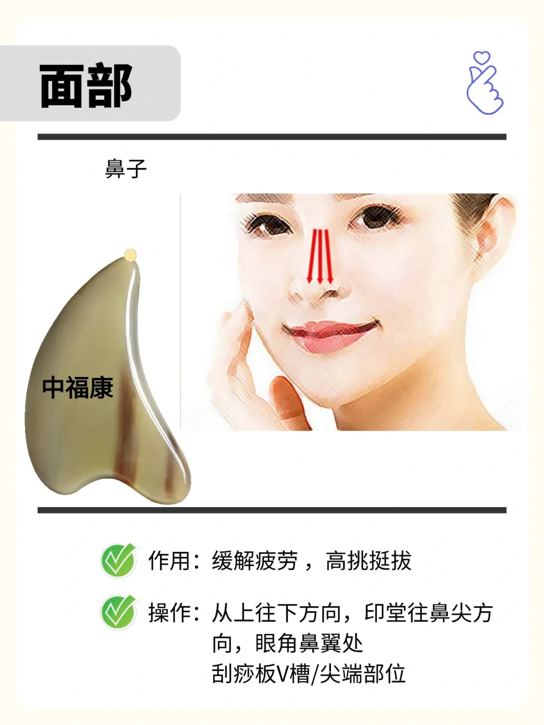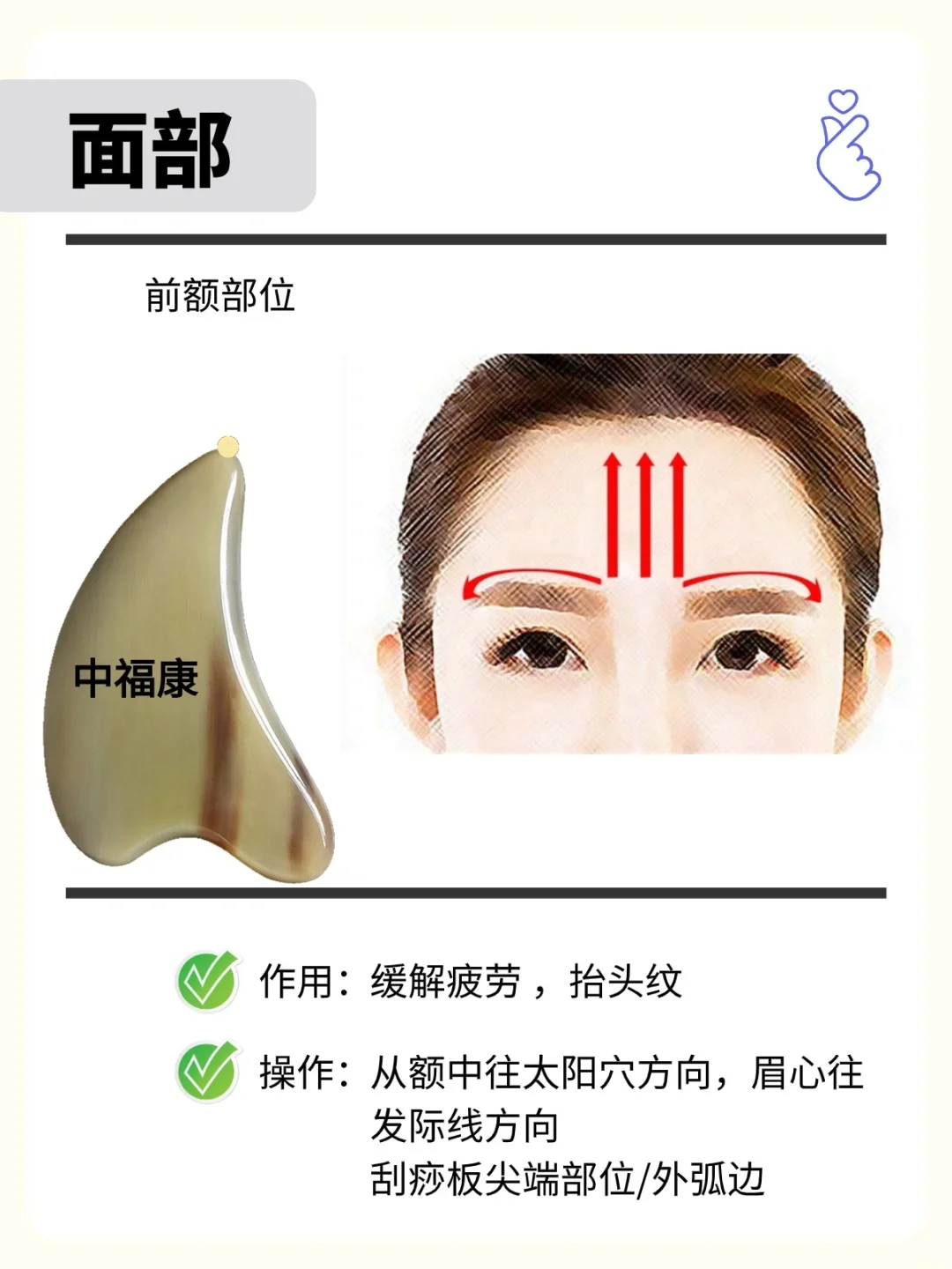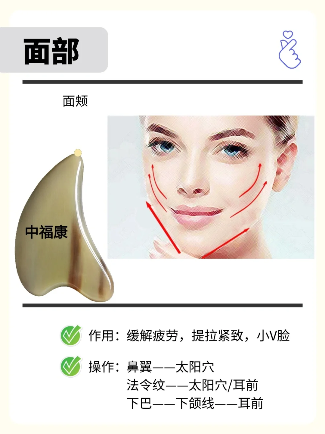 工具:牛角刮痧板或者拨筋棒,刮痧板尖端部或者拨筋棒圆珠端 用直线法、波浪线法、画圈法; - 一,点对点走直线拨筋,部位及方向: 🍀🍀🍀额头部位🍀🍀🍀 1、 从印堂位置→神庭位置 2、 眉头→发际线 3、 鱼腰→发际线 4、 外眼角→发际线 🍀🍀🍀鼻部🍀🍀🍀 5、鼻柱→印堂→发际线 6、迎香→攒足 🍀🍀🍀眼周🍀🍀🍀 7、下眼眶→太阳穴→发际线 8、上眼眶→太阳穴→发际线 🍀🍀🍀耳周🍀🍀🍀 9、瞳子髎→听宫→听会→耳门 🍀🍀🍀嘴周围🍀🍀🍀 10、承浆→地仓→人中 🍀🍀🍀面颊🍀🍀🍀 11、鼻通→颊车→听宫→听会→耳门→翳风,点对点走直线拨经并经耳后排到腋淋巴 12、承浆→颊车→翳风,点对点走直线拨经并经耳后排至腋淋巴 二,波浪线法,重复上面线路 三,画圆圈法拨筋,重复上面线路 四、安抚 五、拨筋到结节处,多重复以上动作 六、整个流程,约20分钟左右 . 牛角刮痧板,拨筋棒,梳子,按摩梳,经络梳; 天然角板,任何2个板都不会一样;