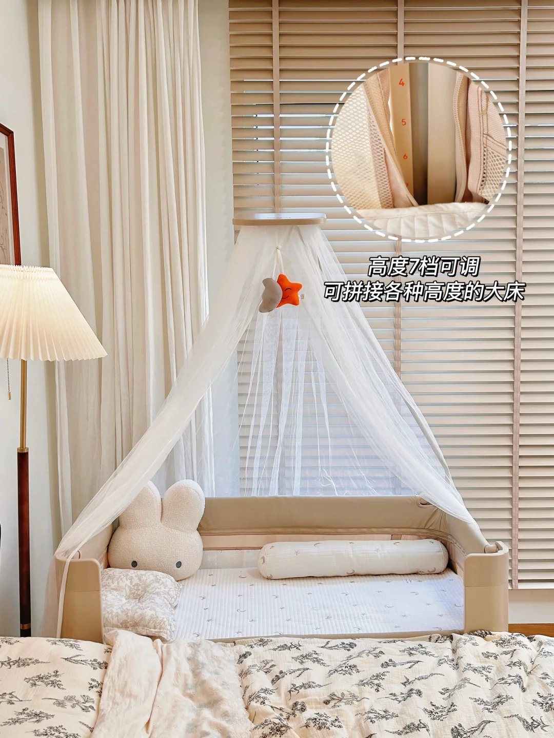 🟢拼接床模式:有7个档位调节高度,可拼接各种高度的大床,方便照顾宝宝。