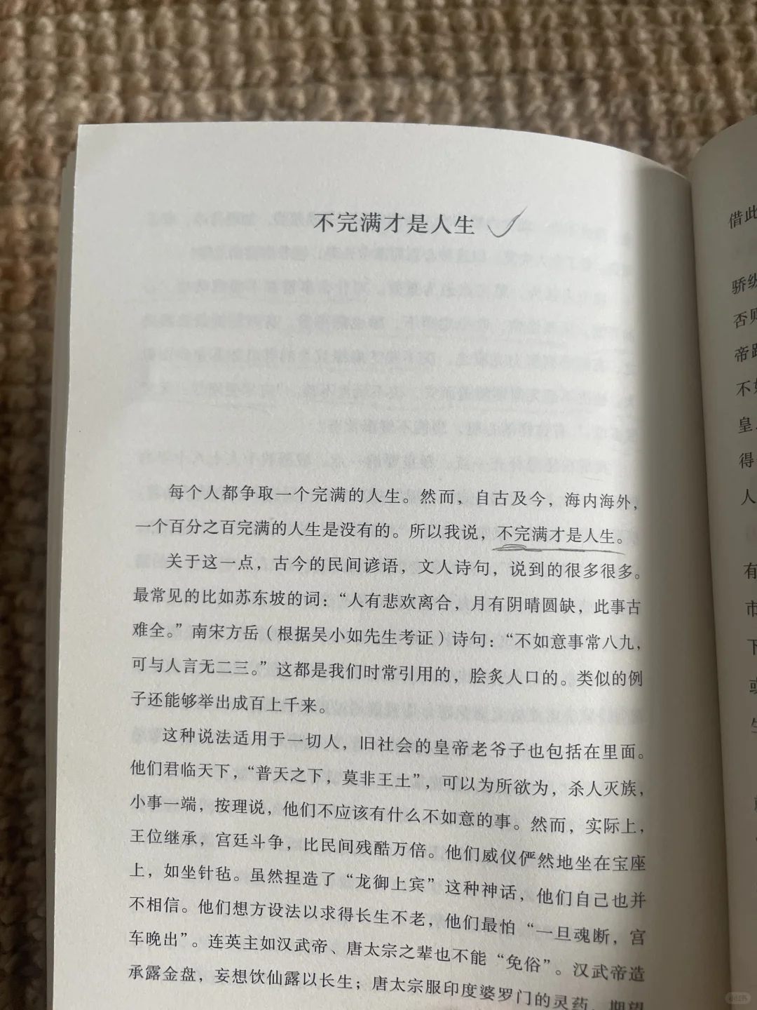 “每个人都争取一个圆满的人生。然而,自古及今,海内海外,一个百分之百圆满的人生是没有的。所以我说,不圆满才是人生。”让我想到一句话,人生是用来体验的 而不是来演绎完美的。