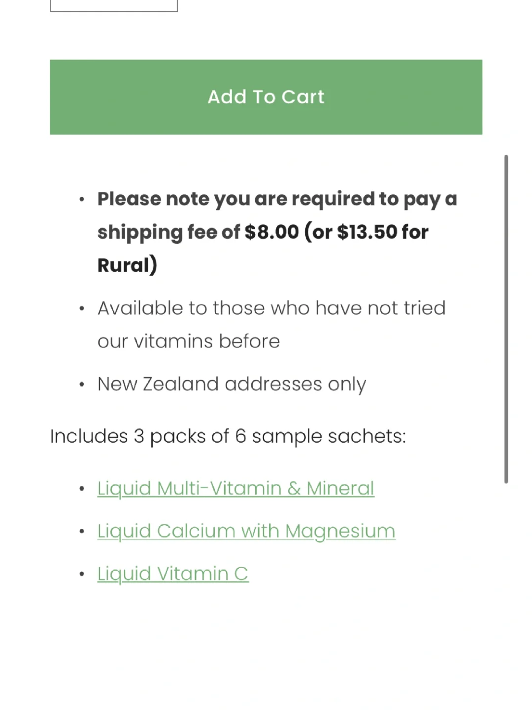 新西兰childlife童年时光现在有赠送活动!免费领取试用装,有三个选择,每盒有6小袋,包括: Liquid Multi-Vitamin & Mineral 多种维生素矿物质液体 Liquid Calcium with Magnesium 液体钙镁 Liquid Vitamin C 液体维生素C 只需要付运费就可以免费拿了,快去领取[哇R][哇R]这个活动出现的太及时了,正需要给孩子提高免疫力用[捂脸R] 关注我,下一篇更精彩