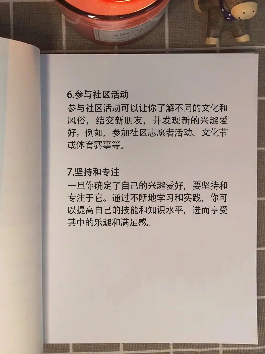 尝试新事物可以让你发现自己的潜在兴趣爱好。例如,学习一门新语言、尝试新的运动项目或参加一个艺术课程等。通过尝试新事物,你可以拓展自己的视野,发现新的兴趣点。