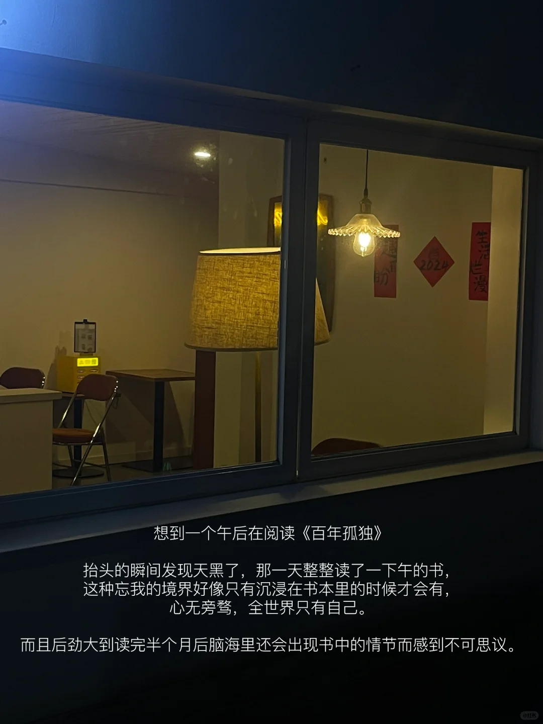 抬头的瞬间发现天黑了,那一天整整读了一下午的书,这种忘我的境界好像只有沉浸在书本里的时候才会有,心无旁骛,全世界只有自己。