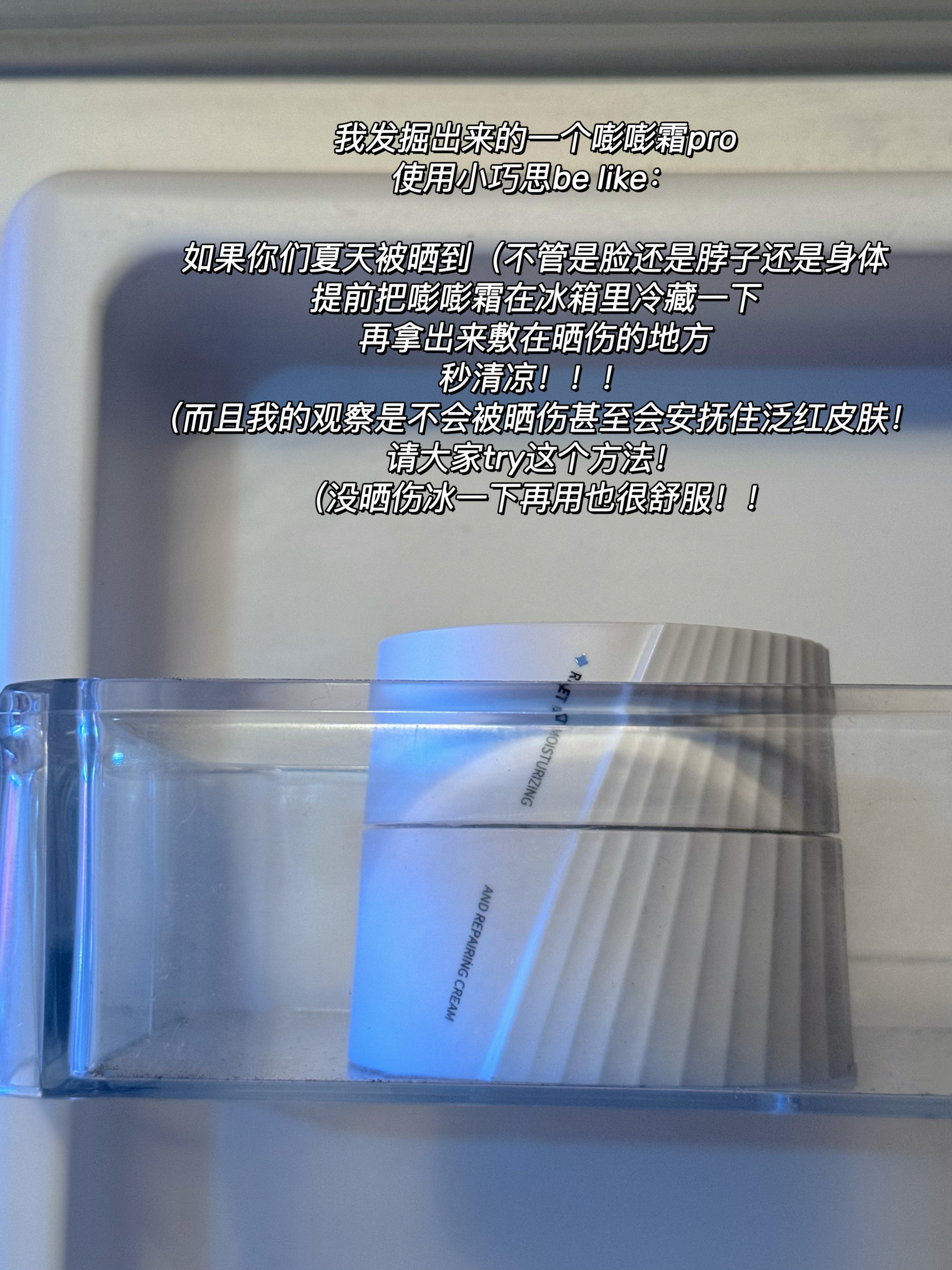 它成分hin精简,没有什么敏皮不耐受的东西,可以厚敷也可以底妆前用,可用性真的很高!而且!我最近发现的小tip是在冰箱里冷藏之后,涂抹在夏天被高温晒伤or泛红的皮肤上!能秒稳定cool down!