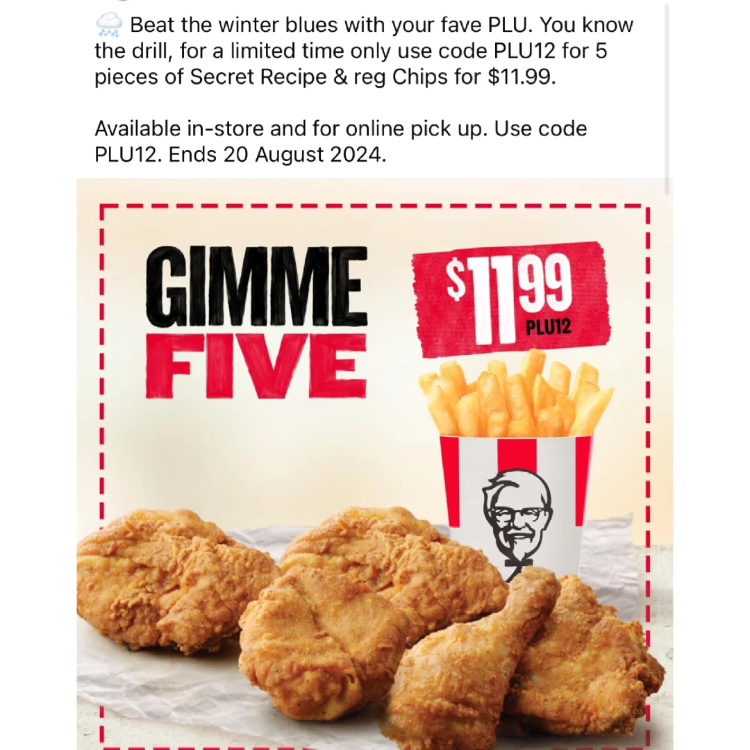 大口炫炸鸡的快乐又来了~[哇R] 肯德基GimmeFive又有啦~5块炸鸡一份薯条售价💰11.99~折扣代码代码PLU12。线上线下都可以使用[得意R] 到2024年8月20日结束[鼓掌R] 关注我,下一篇更精彩