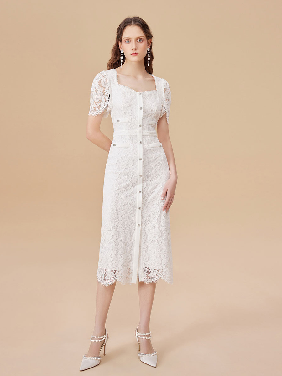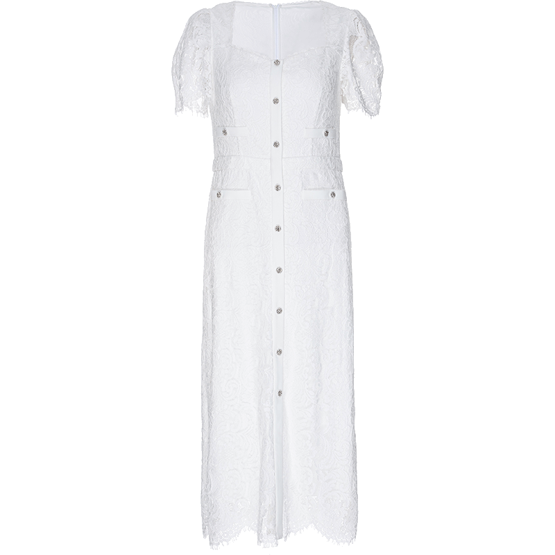 细腻精致蕾丝,彰显浪漫气氛,具品牌特色;修身长裙版型端庄优雅,优化身材比例