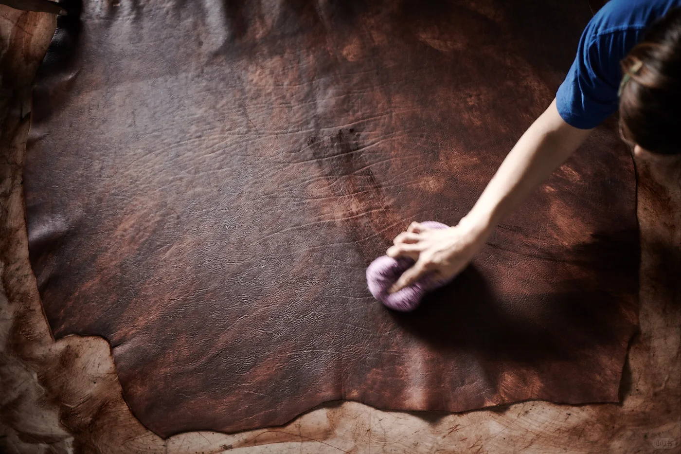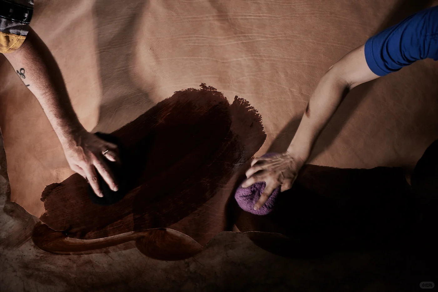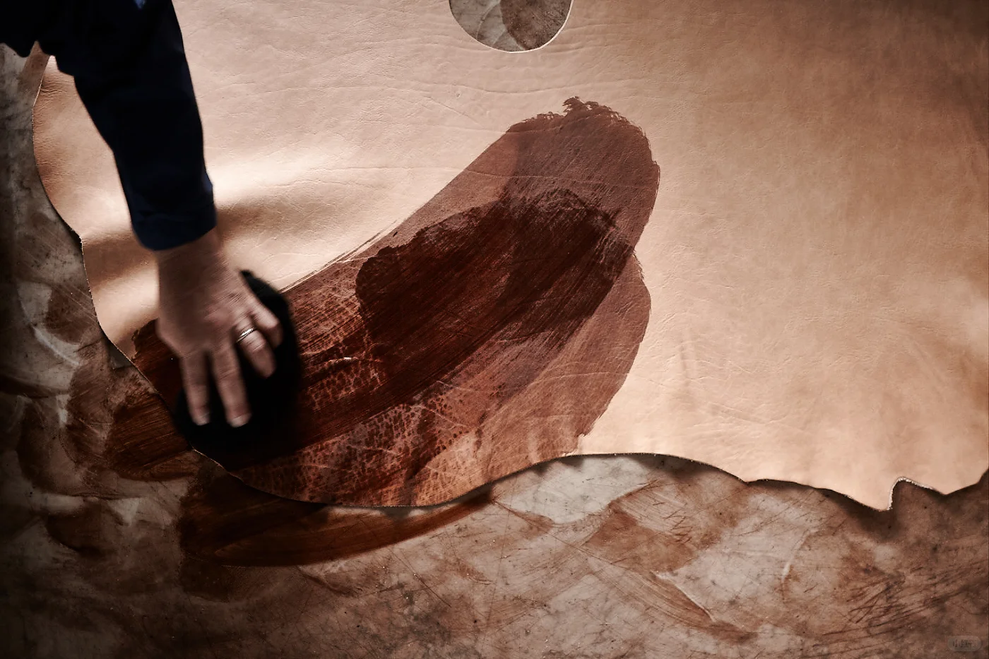 牛皮经过了正式的植物鞣制环节后仍然是湿的,这时候就会进入湿加工的最后一个环节——染色和加脂[清单R] 染色和加脂一般都是以组合的方式进行,目的是给皮革上色,并使其变得柔软[打卡R] 至此,植鞣工艺中的湿加工环节就结束了[星R] 欢迎关注,解锁更多和托斯卡纳植鞣真皮相关的资讯[看R]