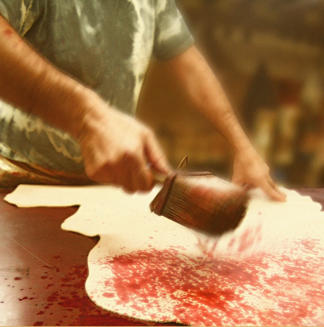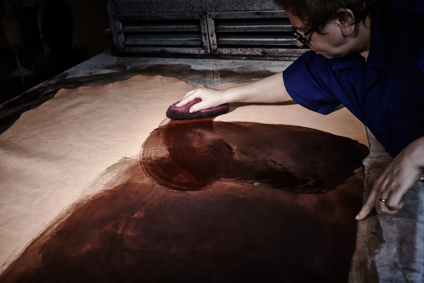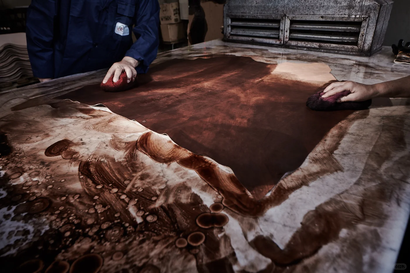 牛皮经过了正式的植物鞣制环节后仍然是湿的,这时候就会进入湿加工的最后一个环节——染色和加脂[清单R] 染色和加脂一般都是以组合的方式进行,目的是给皮革上色,并使其变得柔软[打卡R] 至此,植鞣工艺中的湿加工环节就结束了[星R] 欢迎关注,解锁更多和托斯卡纳植鞣真皮相关的资讯[看R]