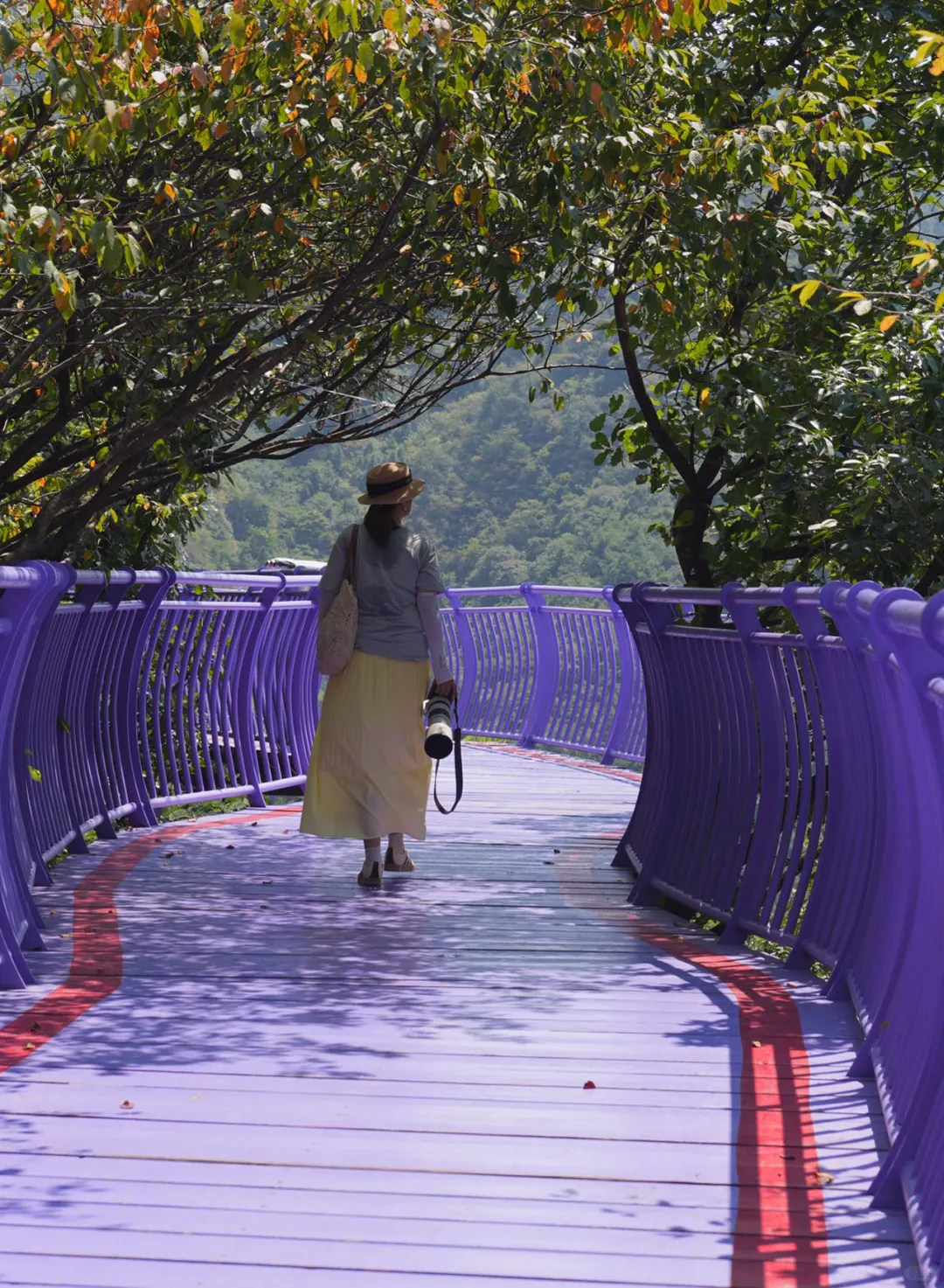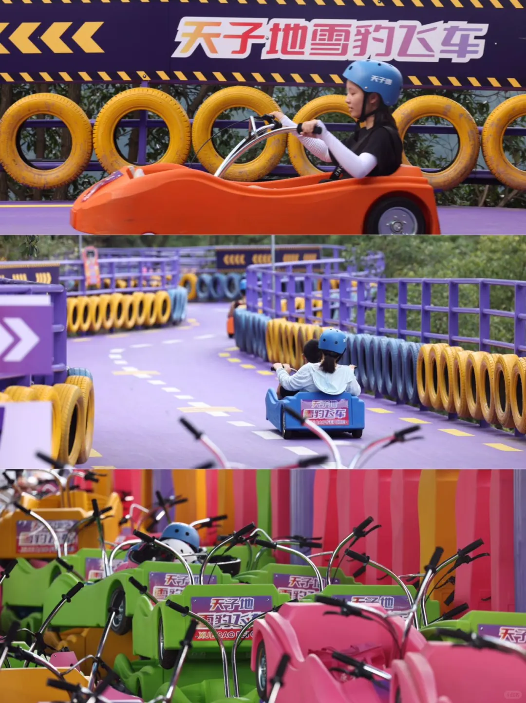 全长2300米 坐着板车穿梭于山林之间 蜿蜒的紫色赛道很有小时候QQ飞车的味道