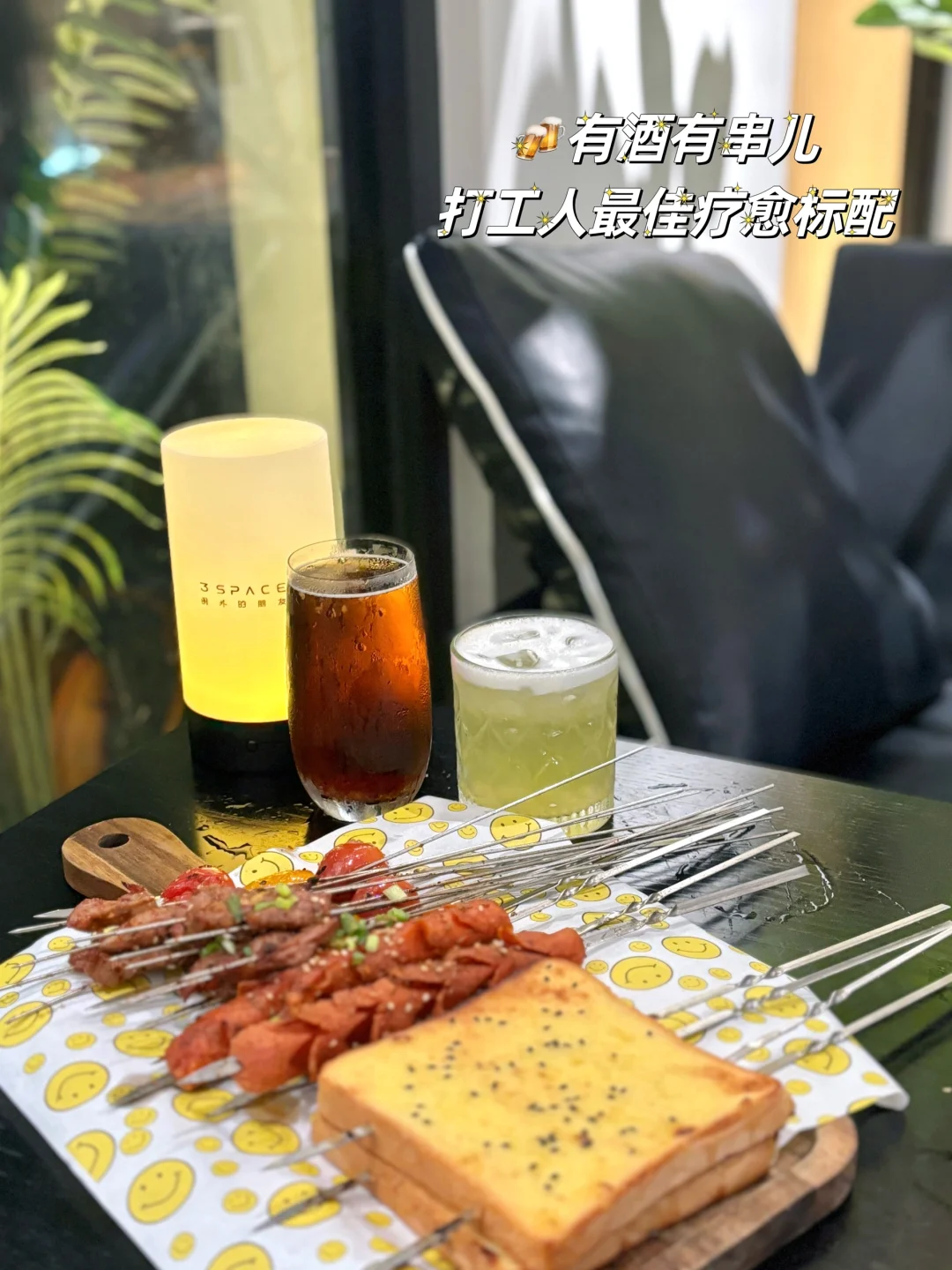 🪴他家有酒🍻也有烤串,🍹鸡尾酒调的很好,简单清新,烤串种类不少,外焦里嫩下酒刚好。