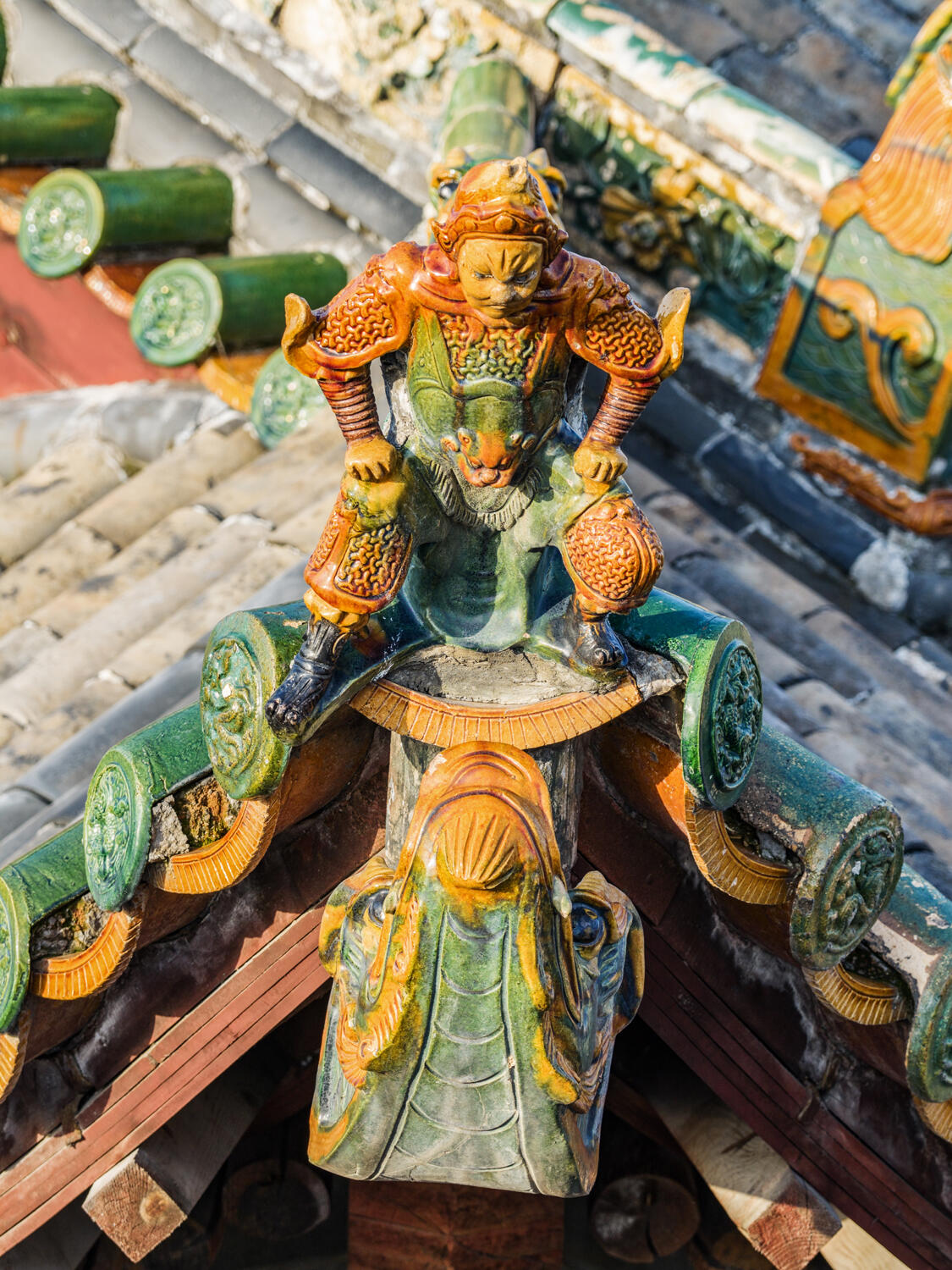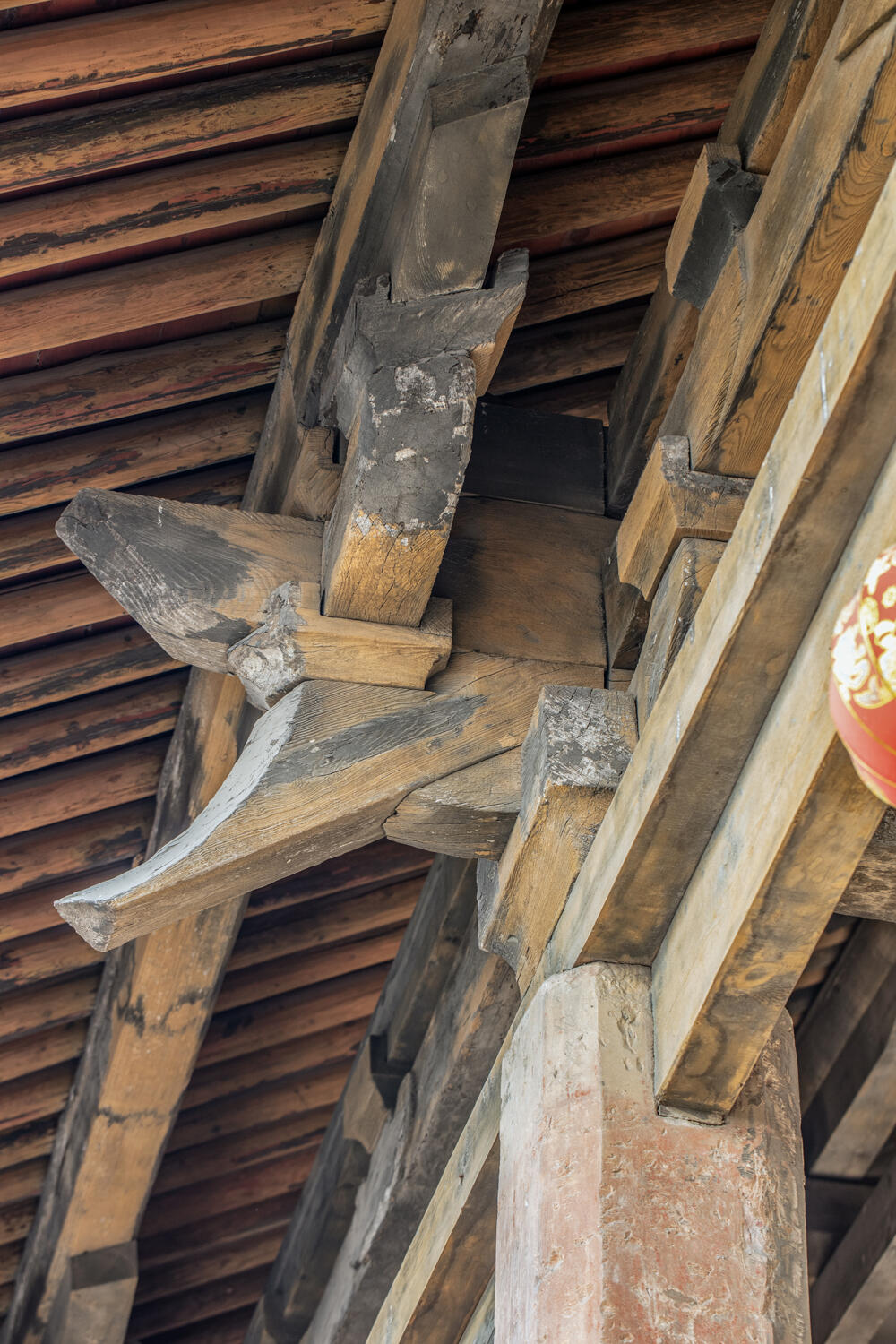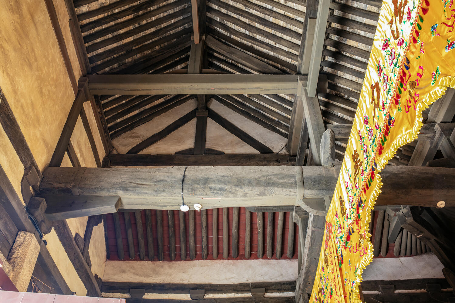 天齐殿的形制带着鲜明的宋代风骨,面阔三间,进深六椽,单檐歇山顶覆盖着灰筒瓦,瓦当的纹路虽已磨损,却依旧能看出当年的精致。梁架举折平缓,没有明清建筑的繁复华丽,却透着一种内敛的力量,出檐深远得恰到好处,既能为殿内遮风挡雨,又不会显得臃肿拖沓。仰头细看,梁架的结构清晰规整,四椽栿压前乳栿用四柱的设计,是宋代建筑的典型手笔,每一根木料的衔接都严丝合缝,仿佛是天生就该长在一起。平梁中段竖着蜀柱,与两侧的叉手形成稳定的三角结构,这种看似简单的构造,却历经数百年地震风雨而不倒,让人不得不惊叹宋代工匠的智慧。四椽袱上的托脚稳稳托住梁架,每一处细节都透着实用与美学的统一,没有一丝多余的装饰,却比任何精雕细琢都更具震撼力。
