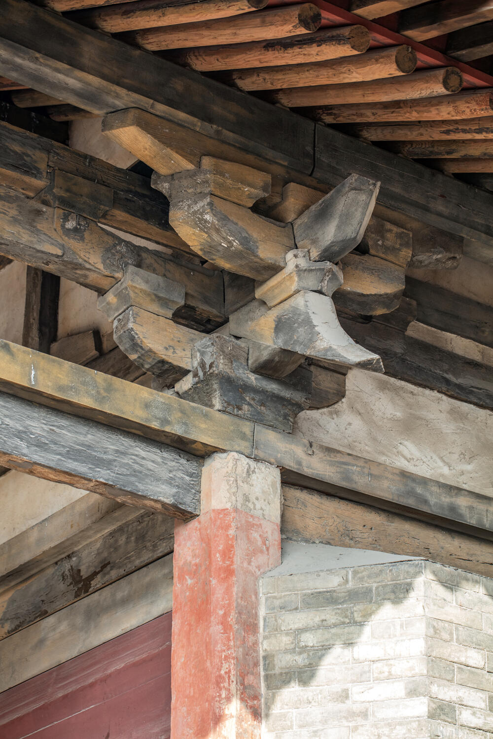 正殿东西两侧的耳殿,是明代建筑的代表,与正殿的古朴形成鲜明对比。耳殿的台基比正殿略低,只有1.3米高,面阔三间,进深四椽,悬山顶覆盖着灰筒瓦,前檐插廊的设计增添了几分灵动。它们就像正殿的守护者,默默陪伴着这座宋代遗构走过数百年时光。明代的建筑风格比宋代多了几分精致,廊下的木雕虽不张扬,却透着细腻的工艺,与正殿的粗犷质朴相得益彰。一宋一明两座建筑并肩而立,就像一部立体的建筑史书,将两个朝代的建筑特色娓娓道来。