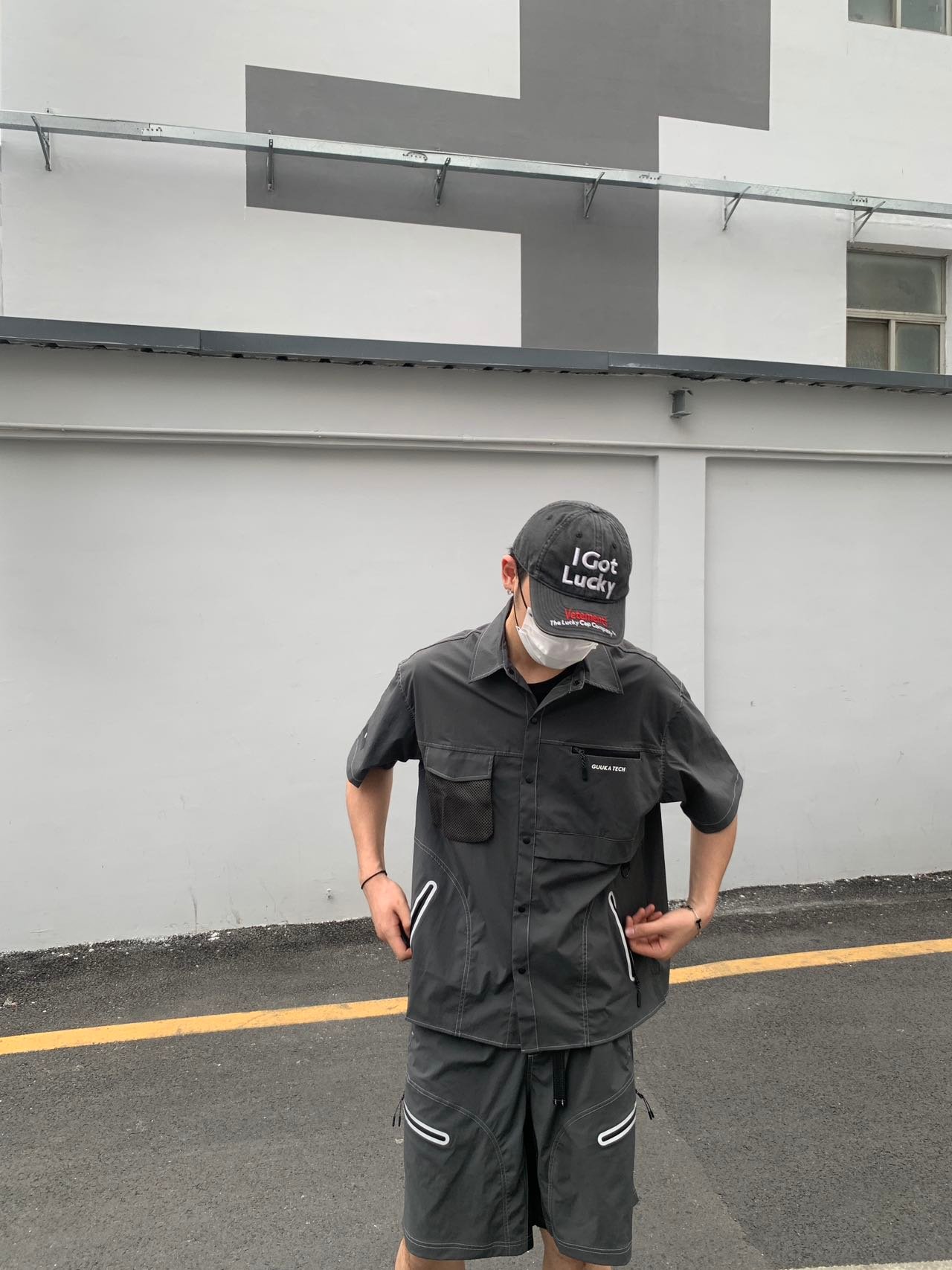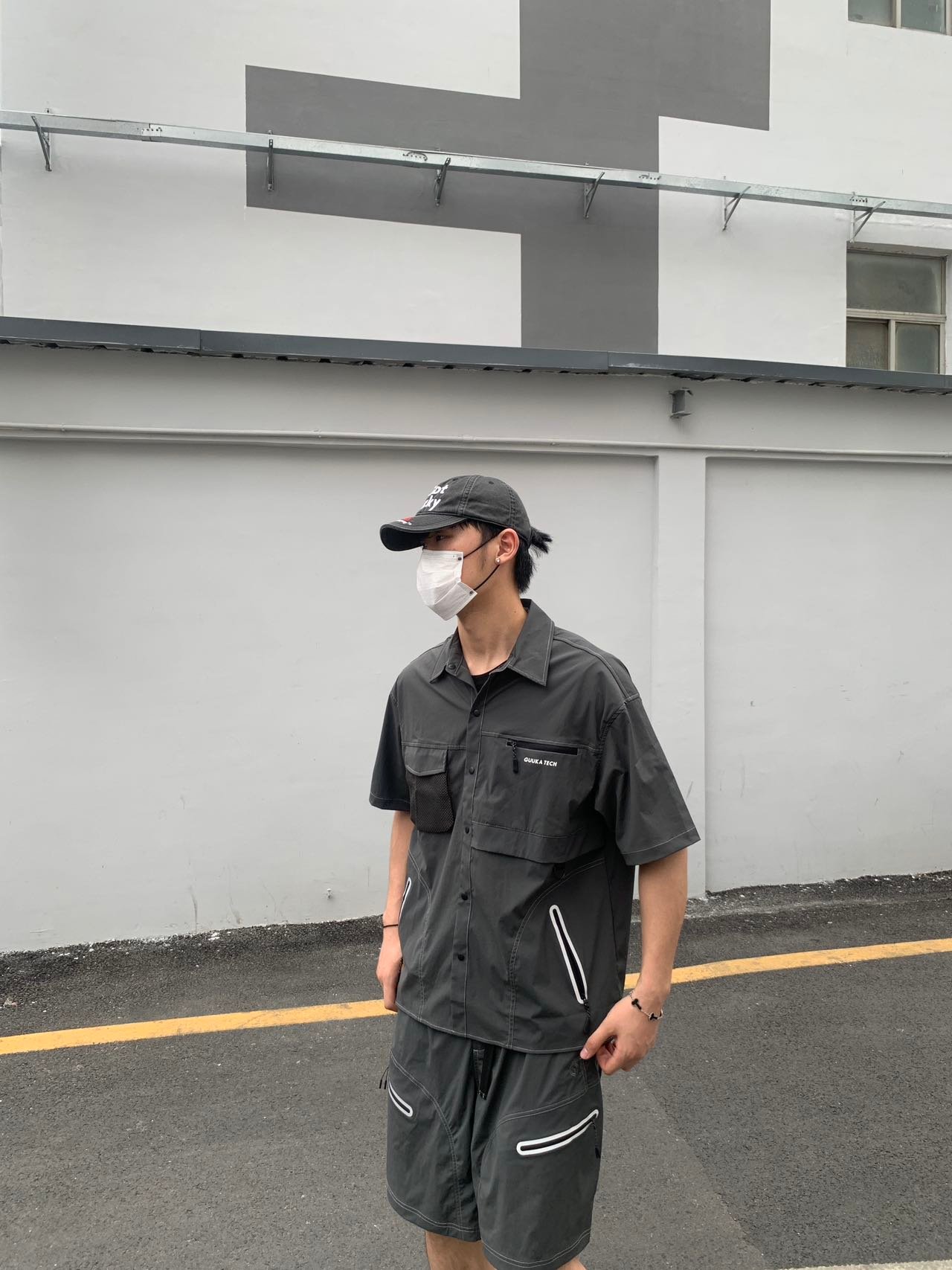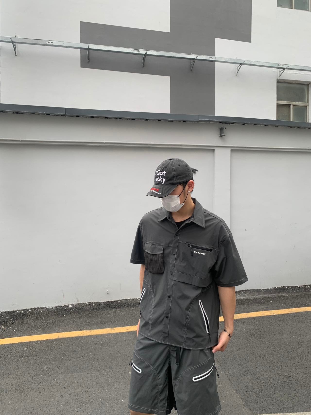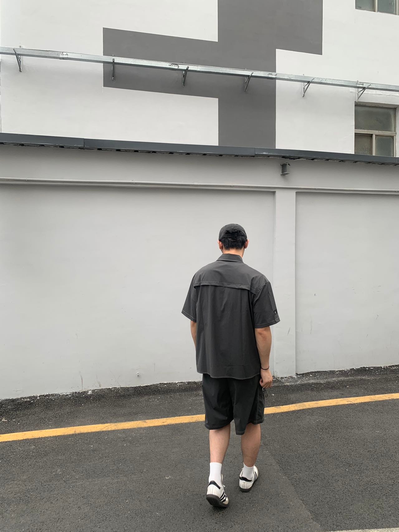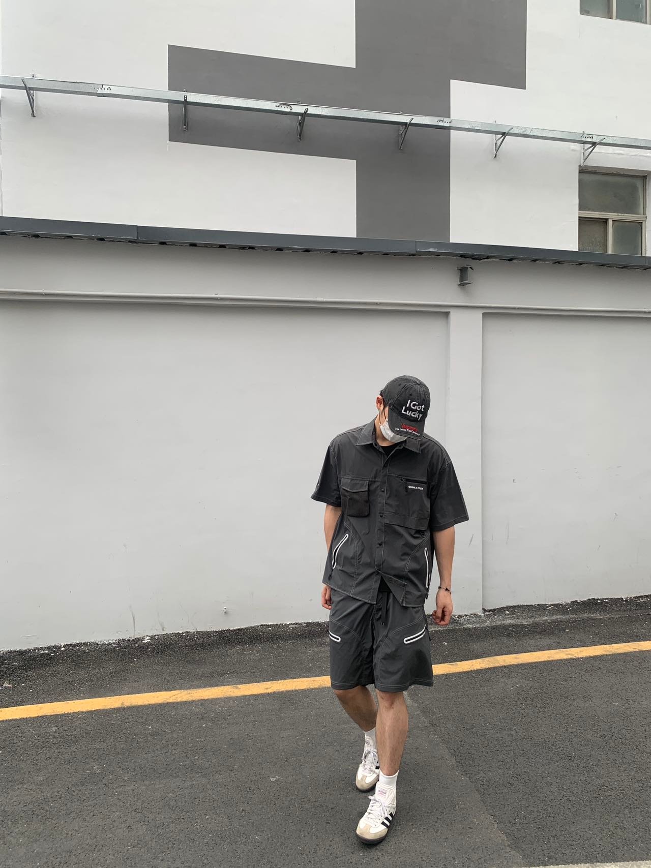 夏天真的少不了这种清爽帅气的穿搭。 衬衫翻领的设计让整体不会过于单调。 胸口和下摆处的压胶口袋又增加了酷炫感。 短裤机能腰带设计机能风满满。 衬衫和短裤都是oversize版型轻松就能穿出时髦慵懒的感觉。 并且是用自带凉感的冰丝材质,触感非常亲肤舒适。