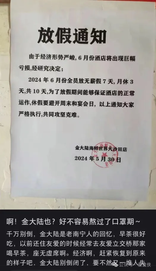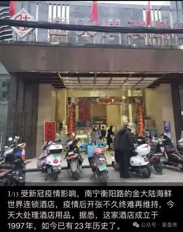 有人艰难的撑过了疫情3年,却还是倒在了全面放开之后。近日,有网友发图爆料:南宁老牌酒店金大陆海鲜世界大沙田店,将出现巨幅亏损,并通知员工无薪放假,共度难关。这事儿到底是真是假?近年来出现巨幅亏损的酒楼,又何止金大陆这一家?是时候揭露真相了。