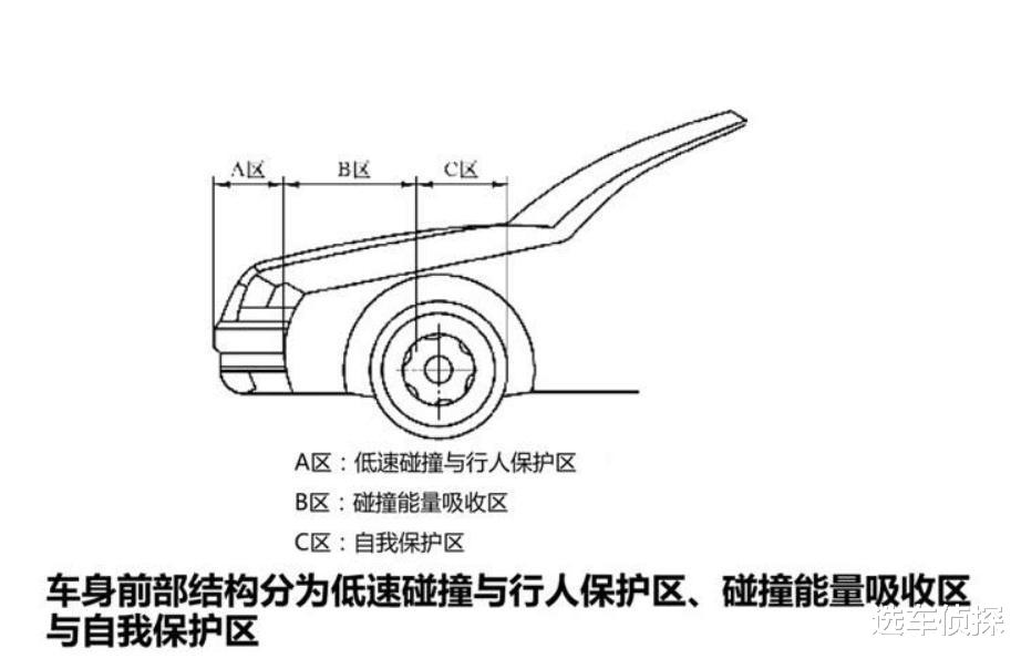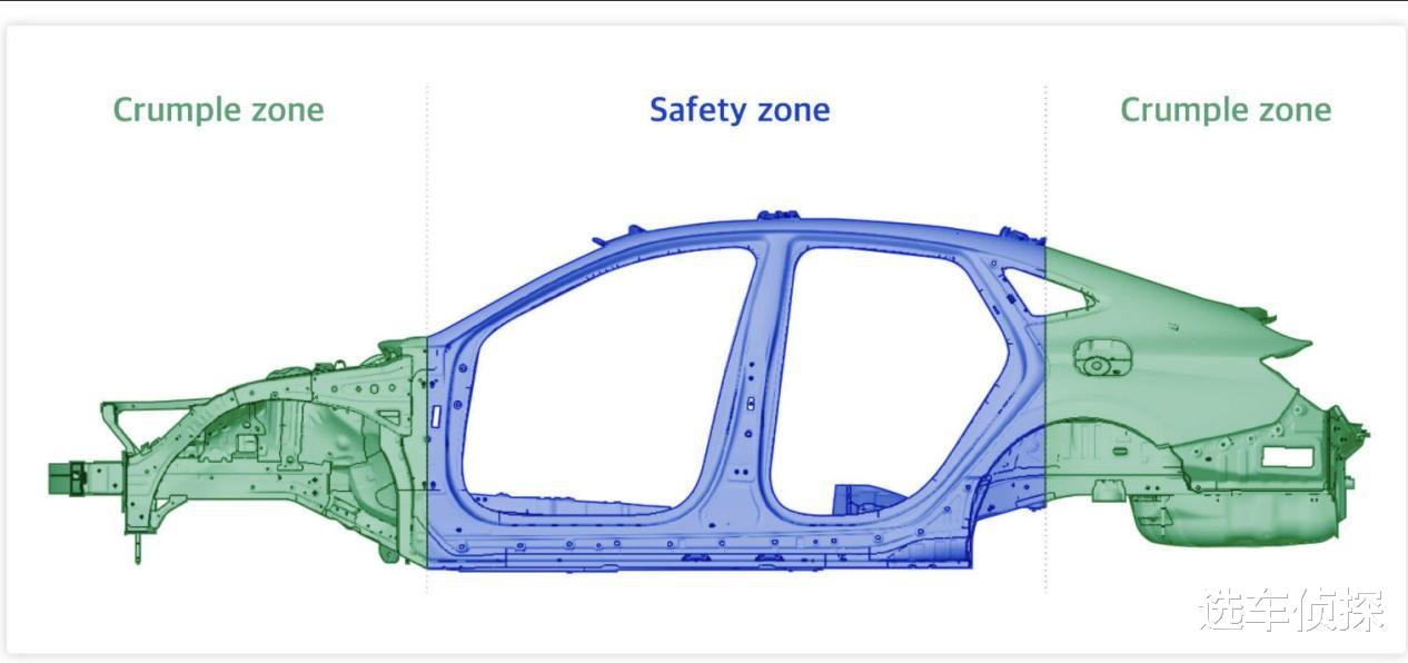 与座舱的硬形成鲜明对比的,是车头和车尾的软,也就是我们常说的溃缩吸能区。在碰撞瞬间,车头和车尾要通过精密设计的变形与压溃,通过前防撞梁、吸能区,像弹簧和海绵一样,将巨大的冲击能量吸收、分散和消耗掉,让传递到座舱内部的冲击力大幅降低。