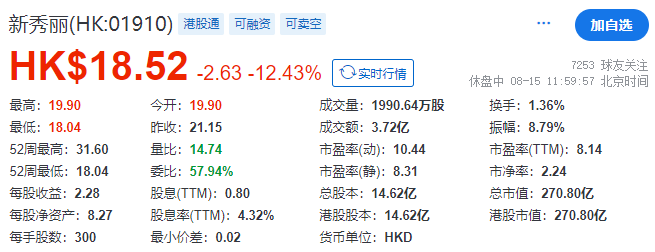 截止午间收市(2024年8月15日),新秀丽(01910.HK)每股报18.52港元,跌12.43%,总市值约270.80亿港元。