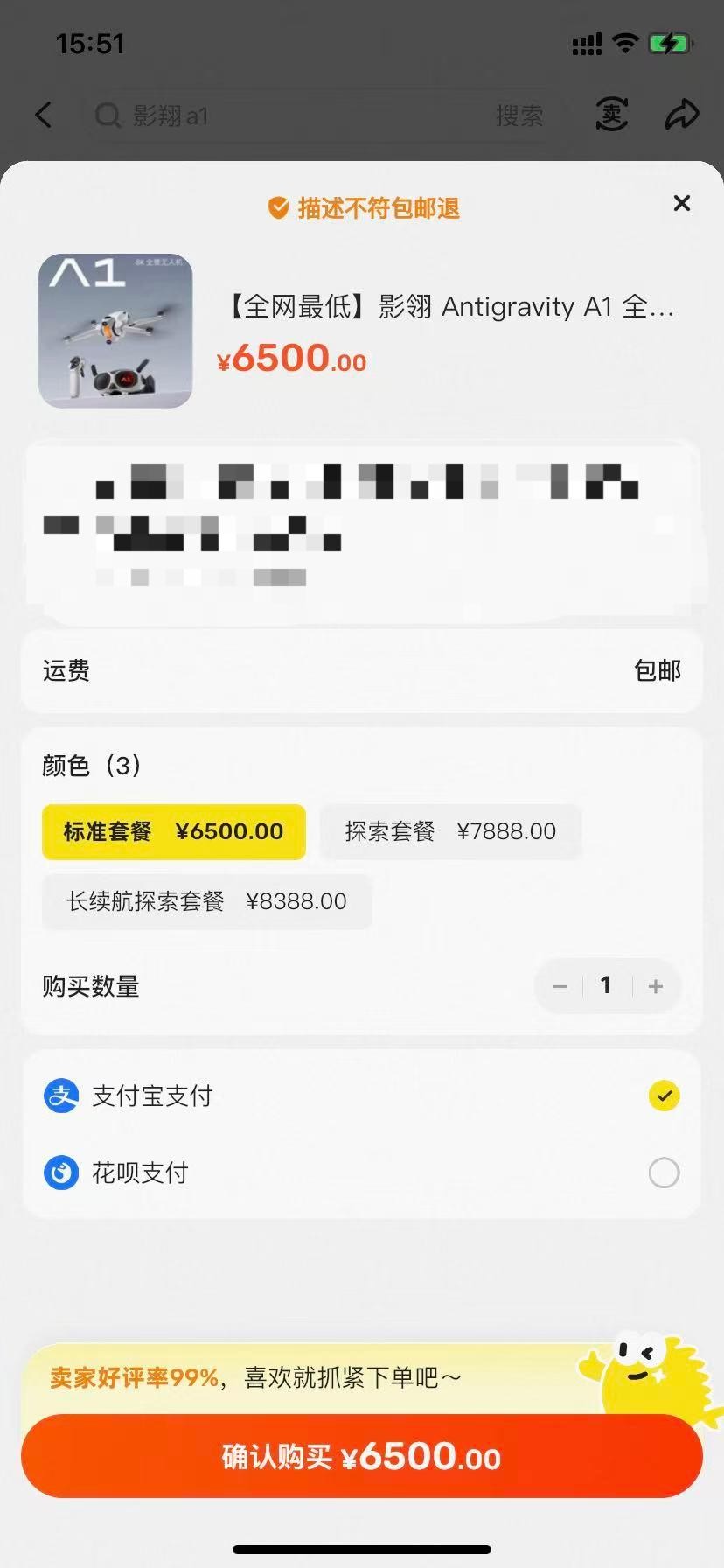 在闲鱼二手平台上,影翎 A1已经出现了“破价”现象。有用户介绍称,“现已到货,正品保障,售后有保障,全国包邮顺丰”,售价标准套餐为6500元,探索套餐为7880元,长续航探索套餐为8388元,均低于国补后的售价。