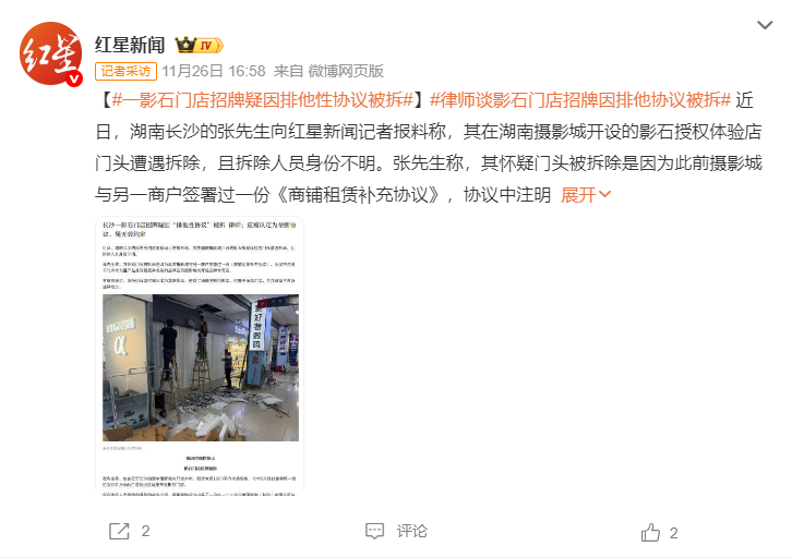 近日,据媒体报道,长沙市的湖南摄影城商户张先生表示,他的店面品牌门头被一群不明身份人员强行拆除。