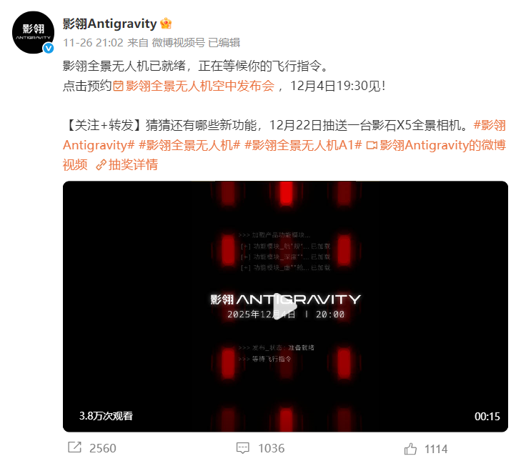 近日,影石与第三方合作孵化的无人机品牌“影翎 Antigravity”宣布其全景无人机产品影翎A1正式上市。