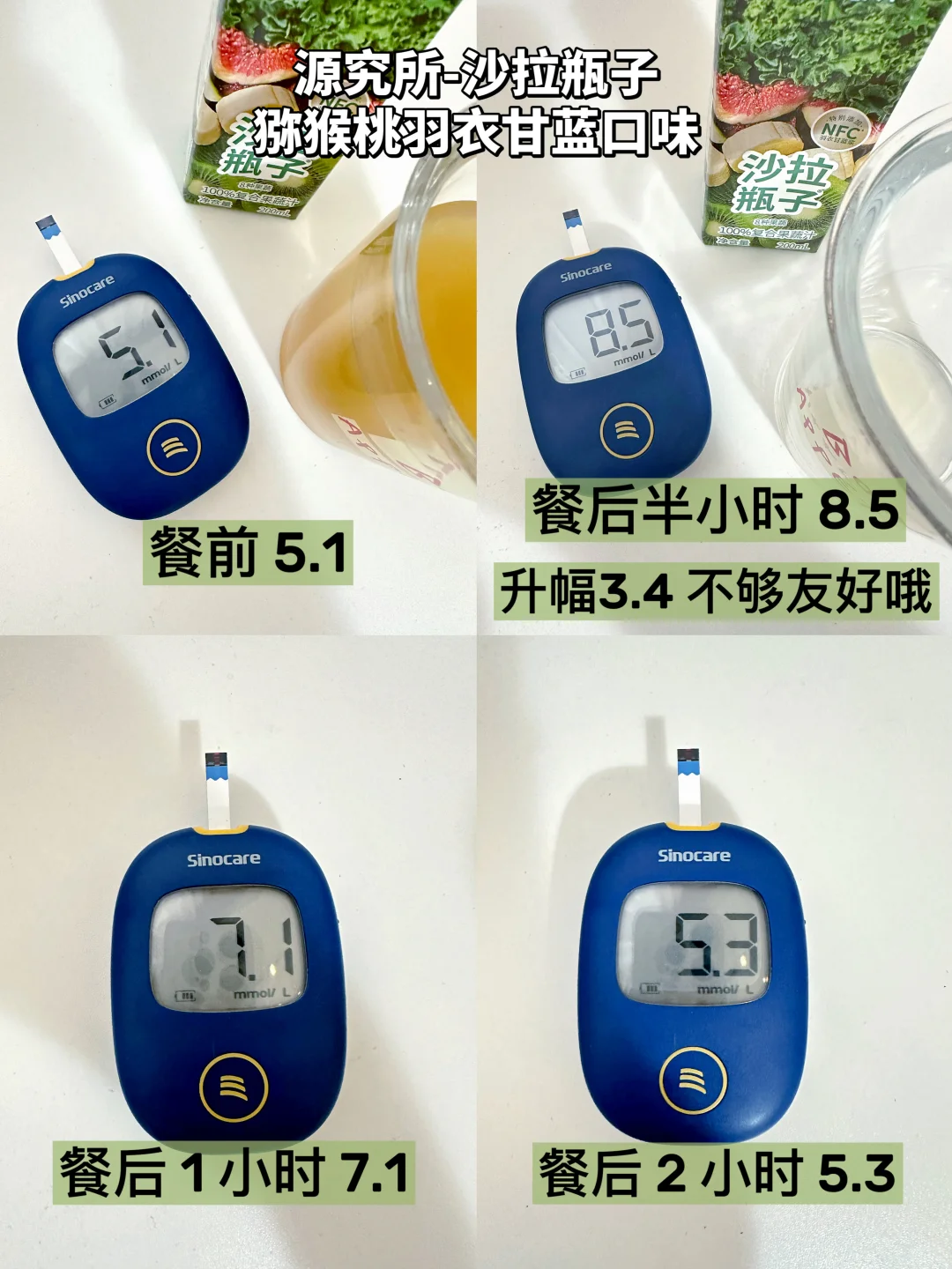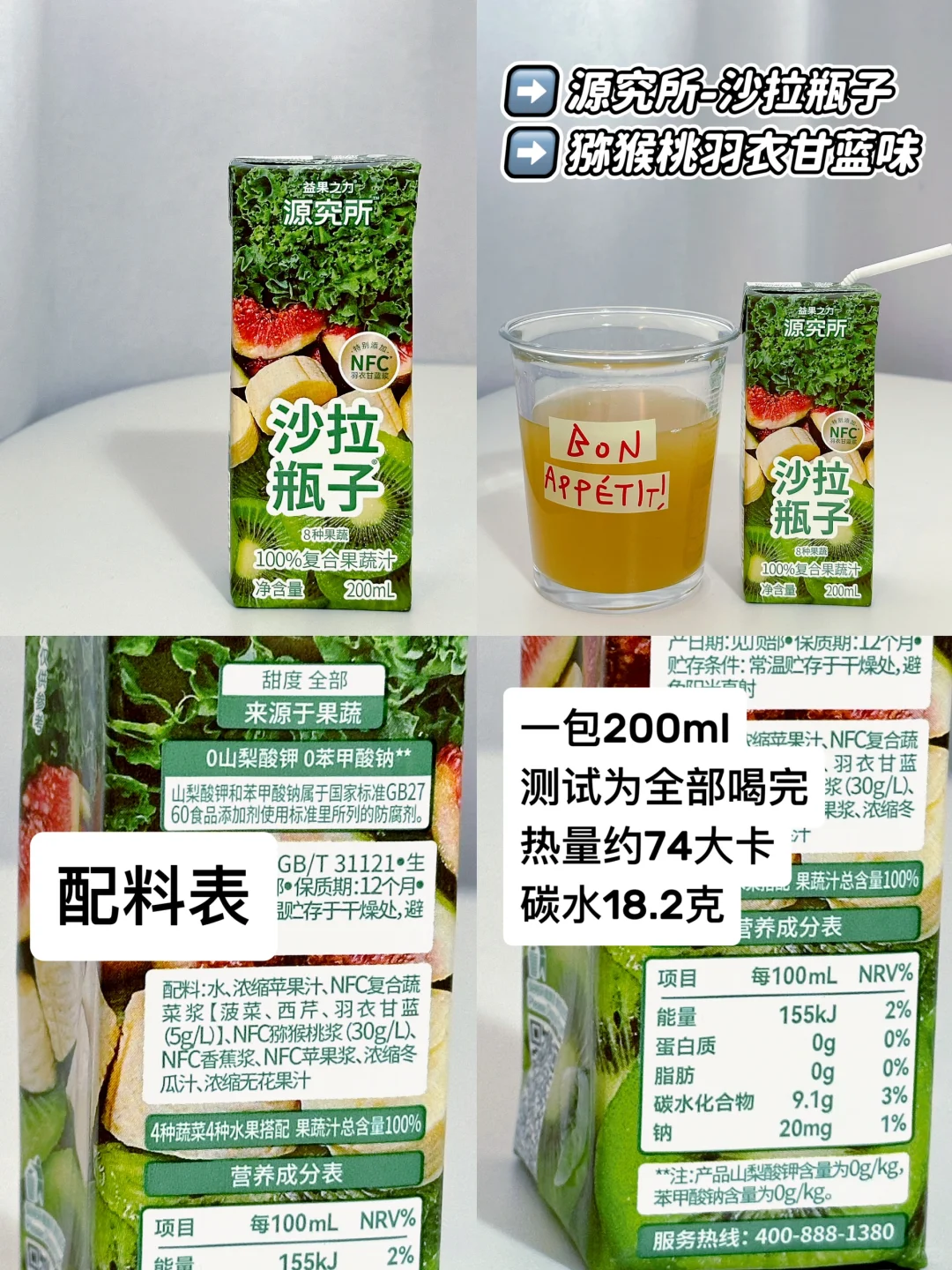 🎈第三款→源究所-沙拉瓶子猕猴桃羽衣甘蓝风味,一瓶200ml,热量约74大卡,碳水18.2克。猕猴桃喝起来不酸,是很温润的甜感。但血🍬升幅3.4,是这几款里最高的,不是很推荐啦。