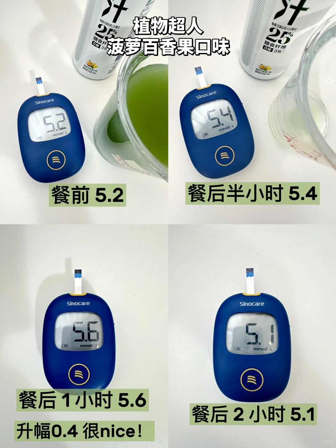 这次升糖测试主要测试了菠萝百香果口味🍍血🍬升幅只有0.4,非常友好哦👌🏻
