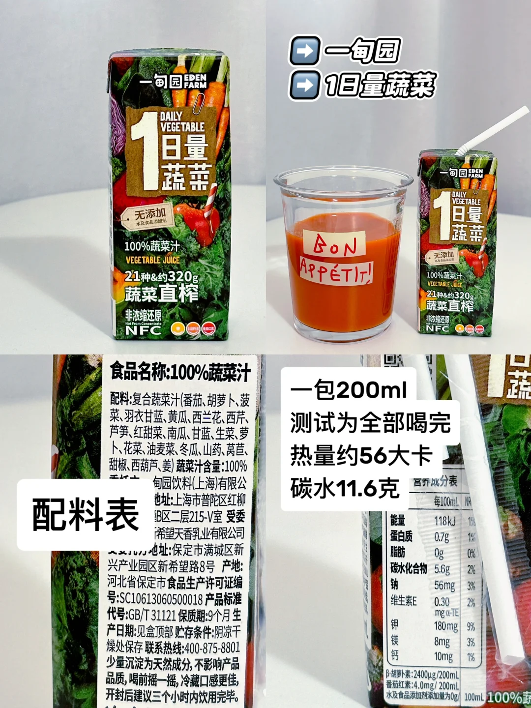 🎈第四款→一甸园1日量蔬菜,一瓶200ml,热量约56大卡,碳水11.6克。血🍬升幅1.6,还可以的哈。南瓜和胡萝卜味比较突出,不是特别甜,口感比较醇厚,我觉得更适合秋冬👌🏻。