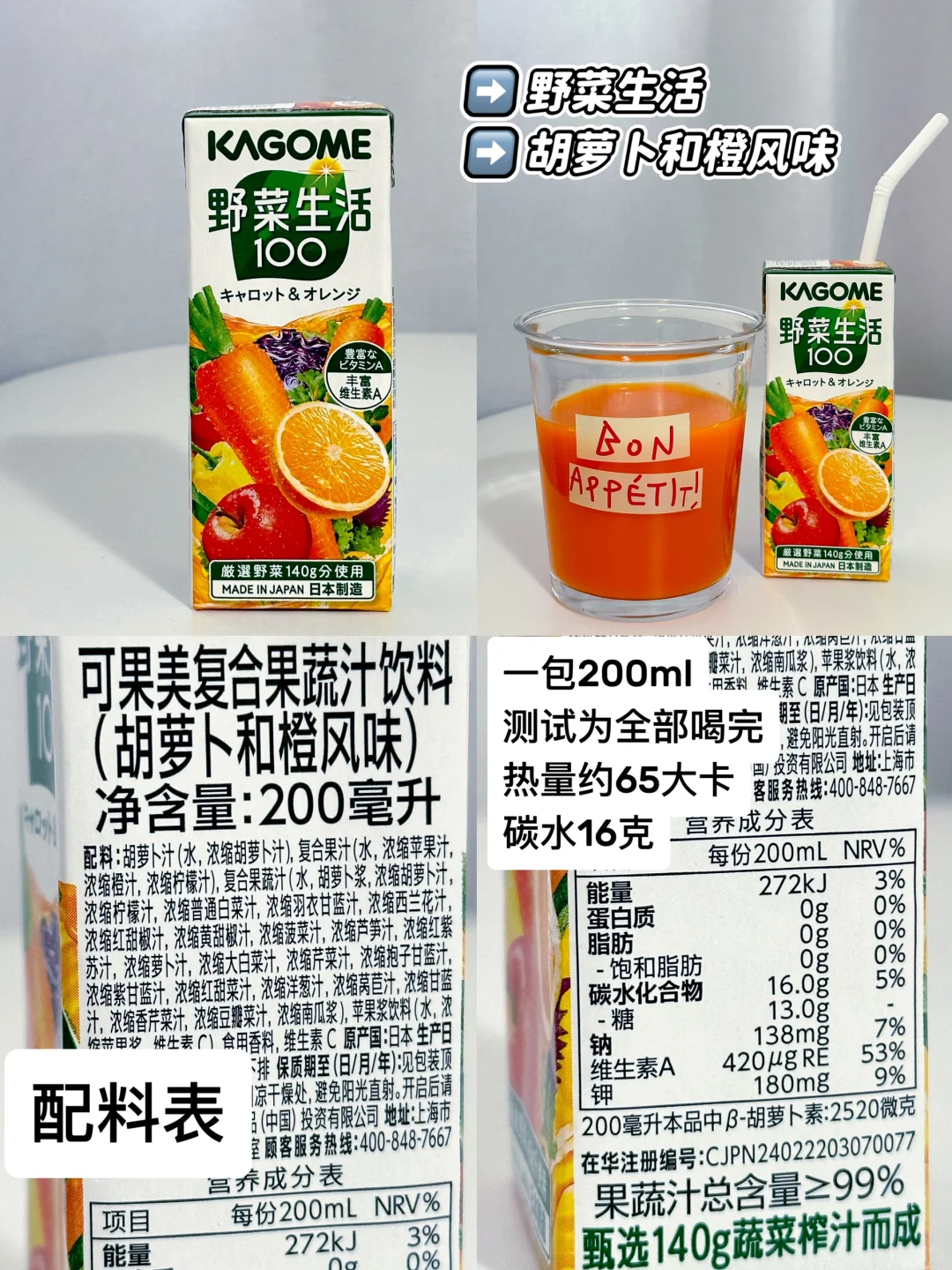 🎈第二款→野菜生活胡萝卜和橙风味,一瓶200ml,热量约65大卡,碳水16克。胡萝卜和橙子的味道,喝起来偏甜。