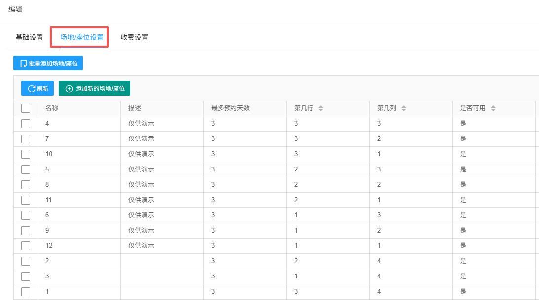 在房间信息编辑界面上方,点击“场地/座位设置”,并按编号、行列位置添加场地。
