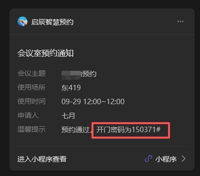 提交预约后,即可收到微信通知消息或短信消息,包含共享会议室的智能门锁临时密码,在预约开始前30分钟即可生效开门。