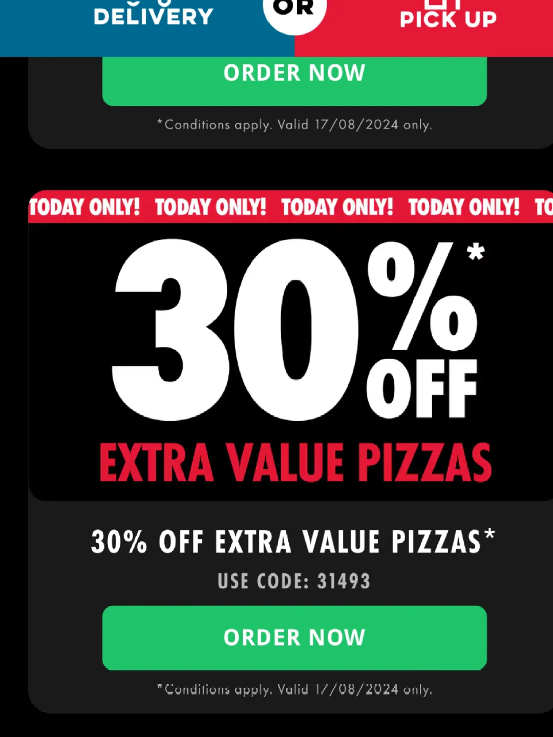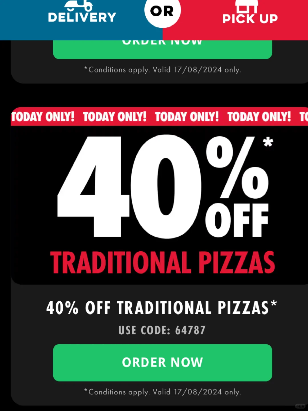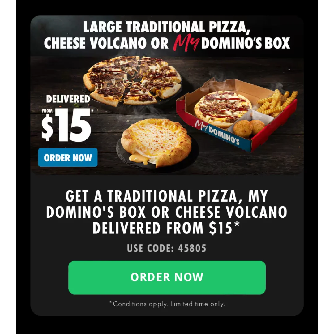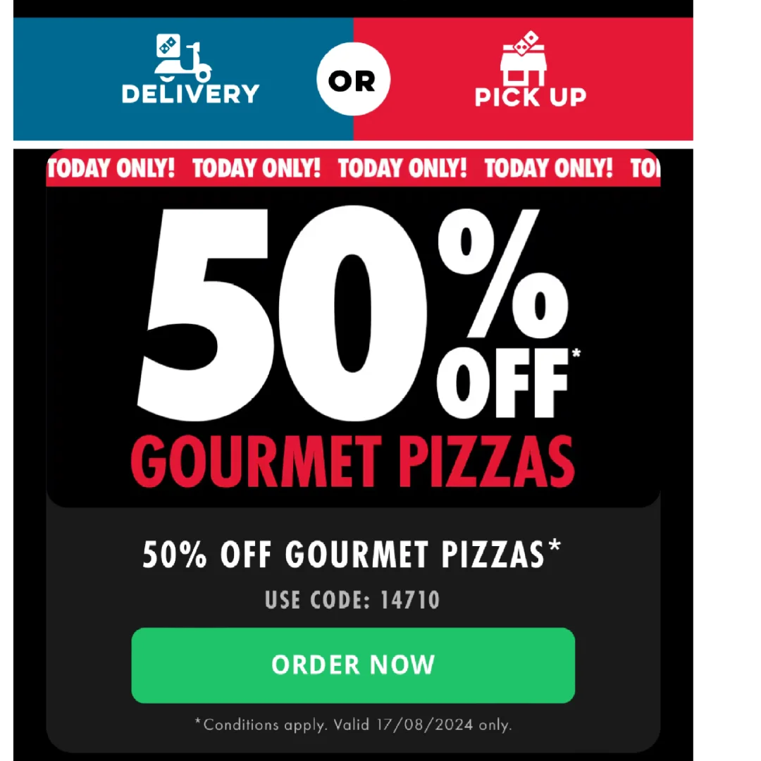 Dominos一天特价!!赶紧去薅羊毛! 50% Off Gourmet Pizzas - 代码14710 40% Off Traditional Pizzas - 代码64787 30% Off Extra Value Pizzas - 代码31493 别的优惠还有小吃六刀一份洋葱圈,披萨拼盘盒等!还有新品必尝[哇R][哇R] 消费满20配送! 关注我,下一篇更精彩