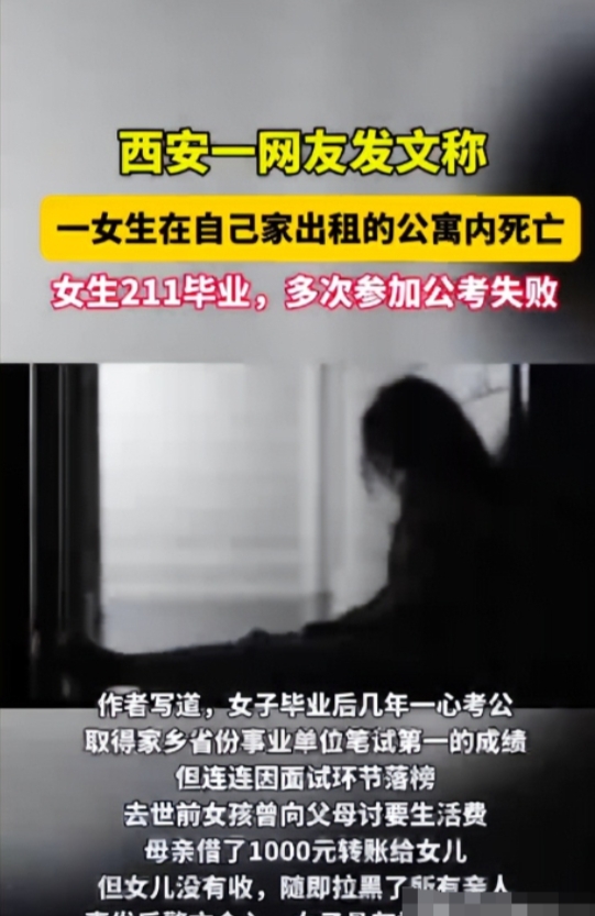 33岁的女孩,211本硕,却把自己饿死在出租屋里!是社会的悲哀还是人生的无奈?20天不进食、不社交,到底是是这样一种孤独、绝望? 农村贫困家庭走出来的大学生,心里到底承受着怎样的压力?父母含辛茹苦举全家之力,供出来的大学生,承载着全家人的希望,可是现实是残酷的,女孩不仅无法回馈家庭,连自己都养活不了,她的内心有多绝望?作为一个女孩子,如果能放下身段,降低预期,也不至于如此穷困潦倒,可是她偏偏放不下自己天之骄子的高傲,一心考公,一次次失败让她彻底绝望,最终以带着孤独的灵魂与世界告别,真的很惋惜!