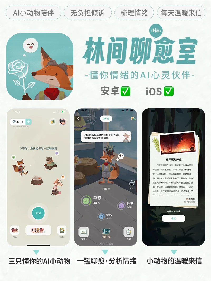 或许让林间的AI小动物们帮你吧, 他们会根据你说的话分析情绪, 帮你一起找到情绪背后未被满足的需求。