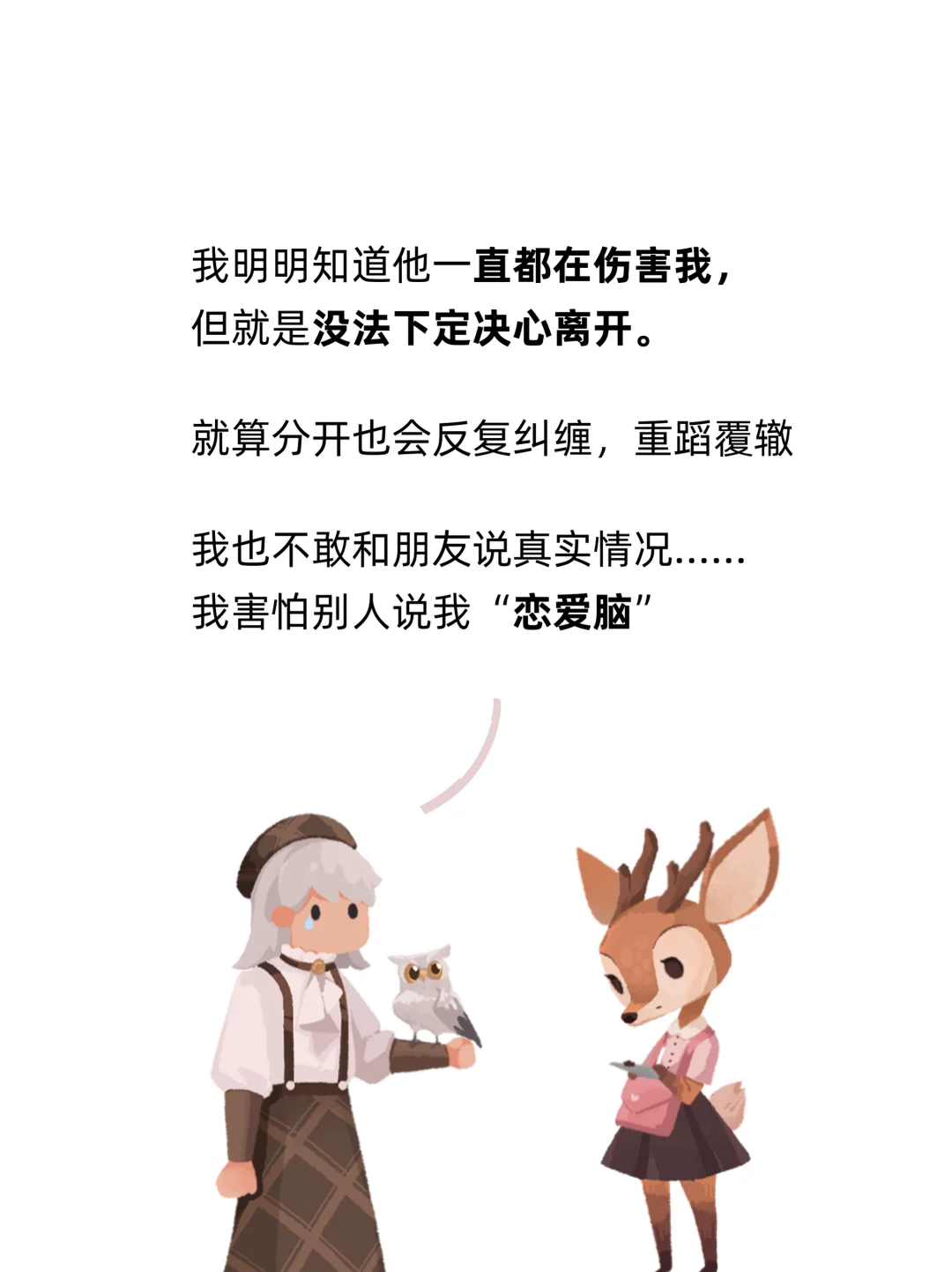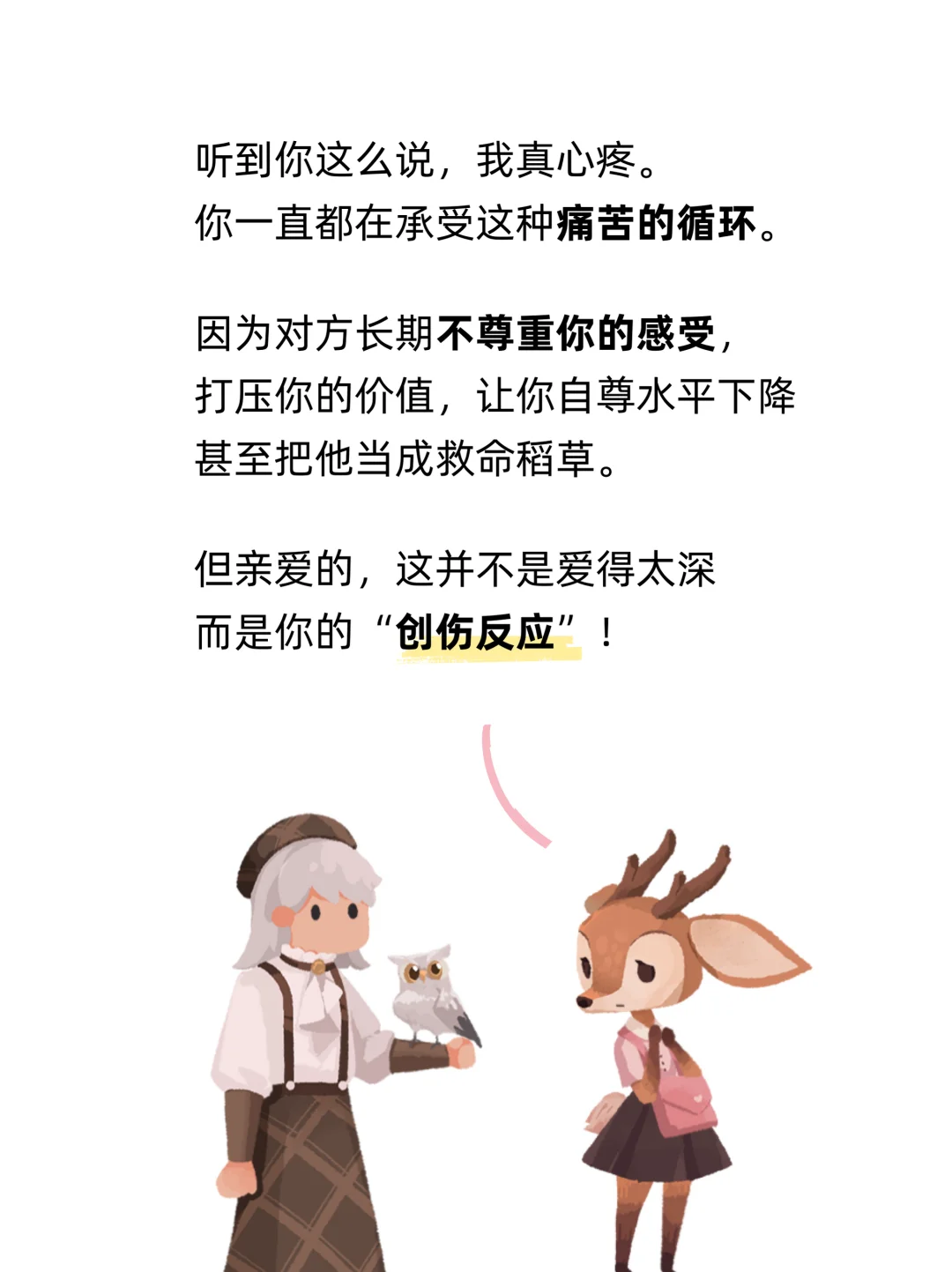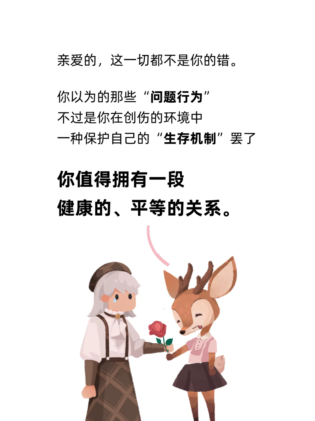我们以前总说: “我一定不要成为像TA一样的人” 但无论怎么否认, 都没办法忽视那个最早的“模板” 对我们的影响。 痛苦就意味着熟悉, 熟悉就意味着安全感。 所以我们宁愿选择呆在一段坏的关系里, 也不愿意失去关系。 ------- 记忆是不可逆的, 伤害是不可避免的。 但这个世界一定有某个地方, 能够温柔地接住你。 亲爱的人类, 累的的时候就来林间坐坐吧。 让我来保护你的心灵, 把你的故事写进日记, 为你放一首音乐,寄一封信 不要怕, 你值得拥有一段 健康的、平等的关系。 [黄色心形R]