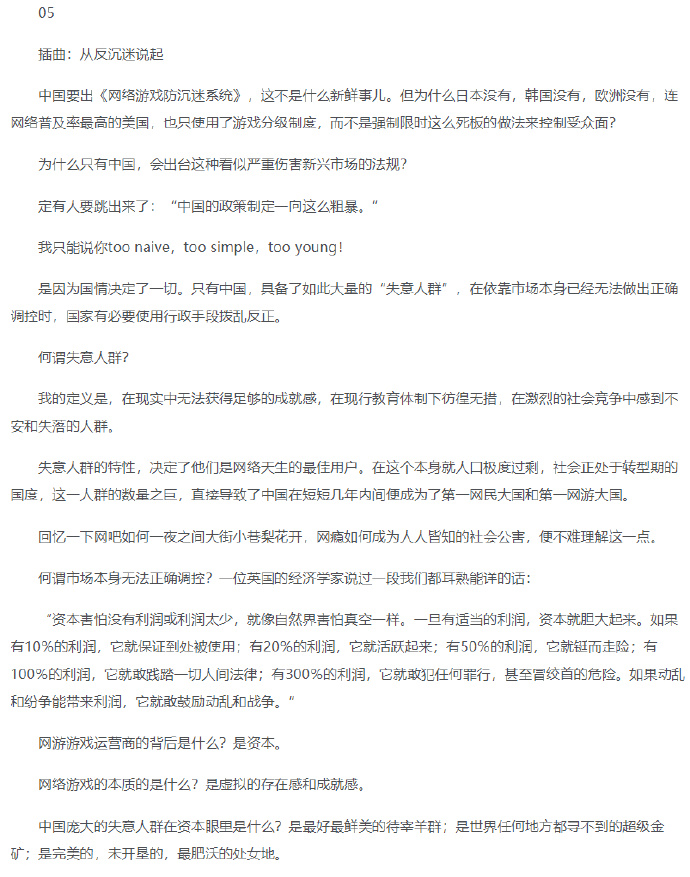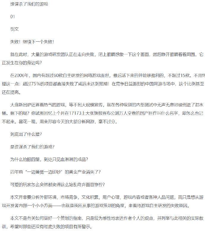 原来《谁谋杀了我们的游戏》这篇当年的神文,作者就是冯骥。卧槽这算不算是最高级别的装逼,“我行我上”,然后他还真的行了...... 概括一下他主要想表达的意思:国内的游戏行业从业者包括他自己在内,每天琢磨着通过让玩家沉迷、互相仇视、拉帮结派、赌博等等,从玩家兜里掏钱。而他则独辟蹊径把矛头直指游戏行业背后的资本。当然了,结果肯定被喷得非常惨。