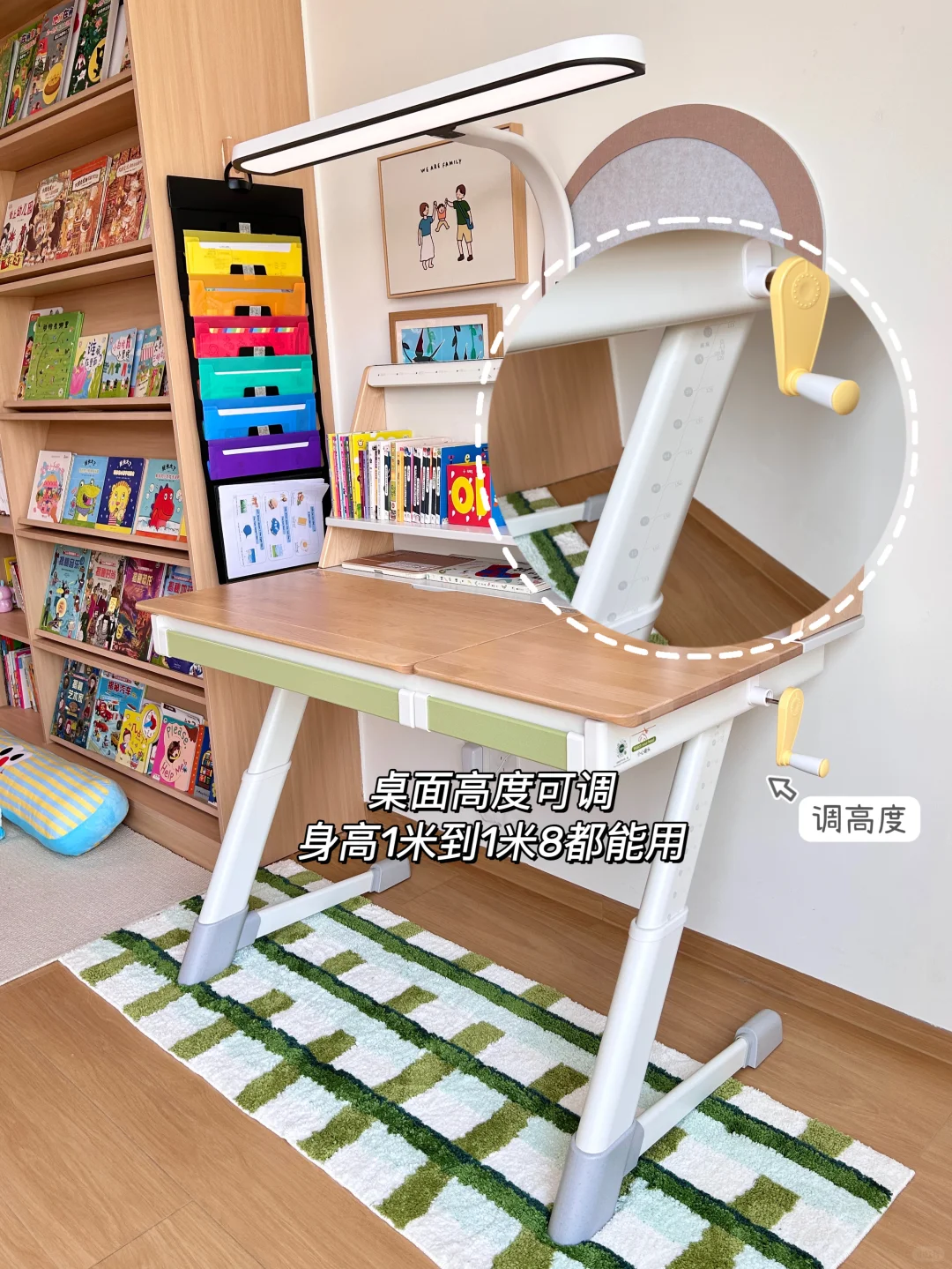 📈桌面高度可根据孩子的身高进行调节,我家娃现在105cm,调到大概第二个位置就够用了,一共有20个调节孔,之后就算长到一米八也够用,一点不会闲置。