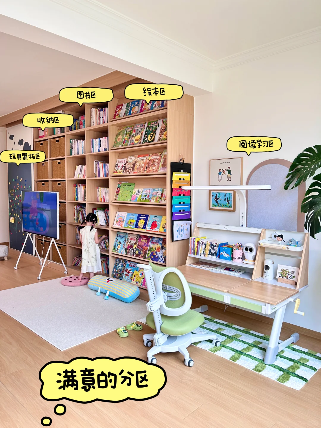 1⃣客厅学习区分区:阅读学习区、绘本区、图书区、杂物收纳区、玩具收纳黑板区。分区很实用,有娃家庭可参考。