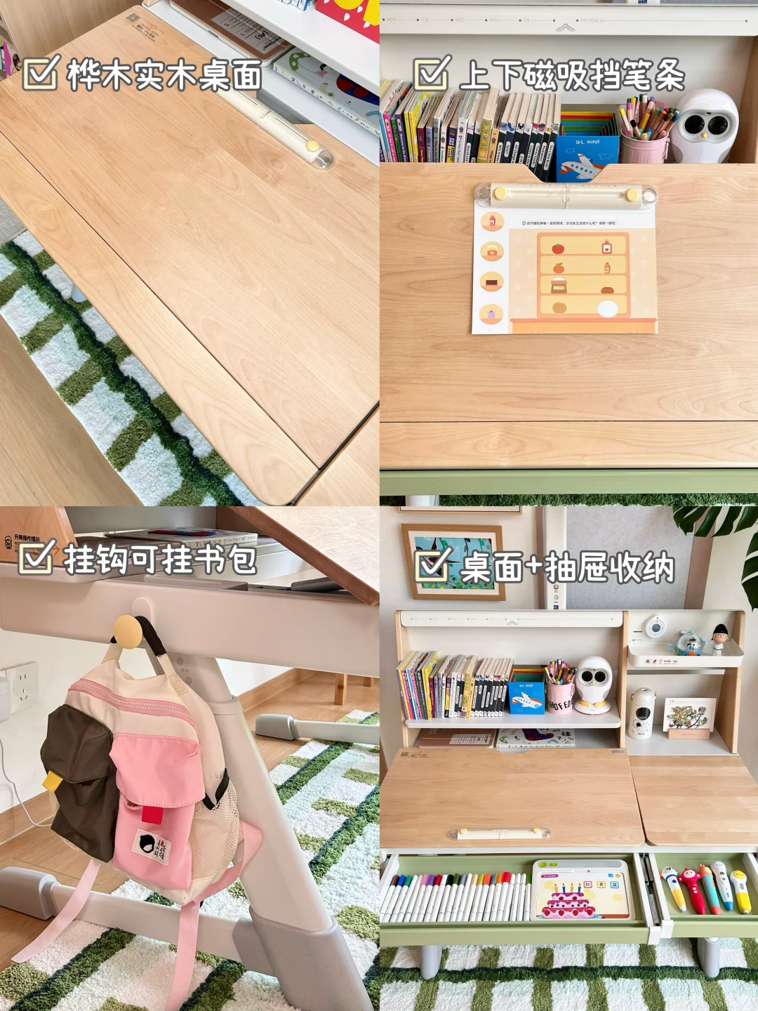 🍃绿色系+原木风和我家也很搭,重点是学习桌质感很好,桌面还用了进口纯实木桦木,环保♻无异味,也不用担心孩子学习的时候有甲醛潜伏!