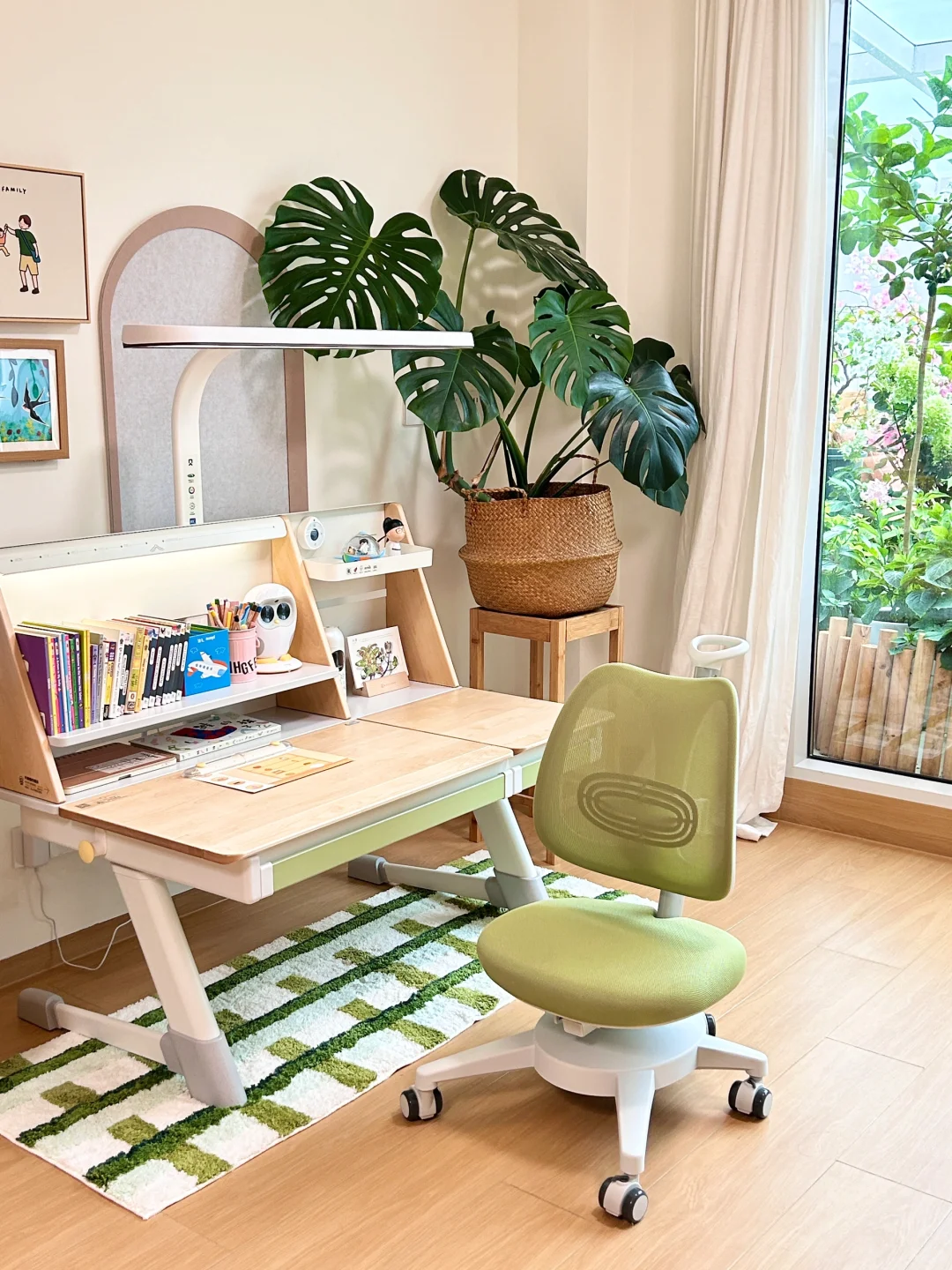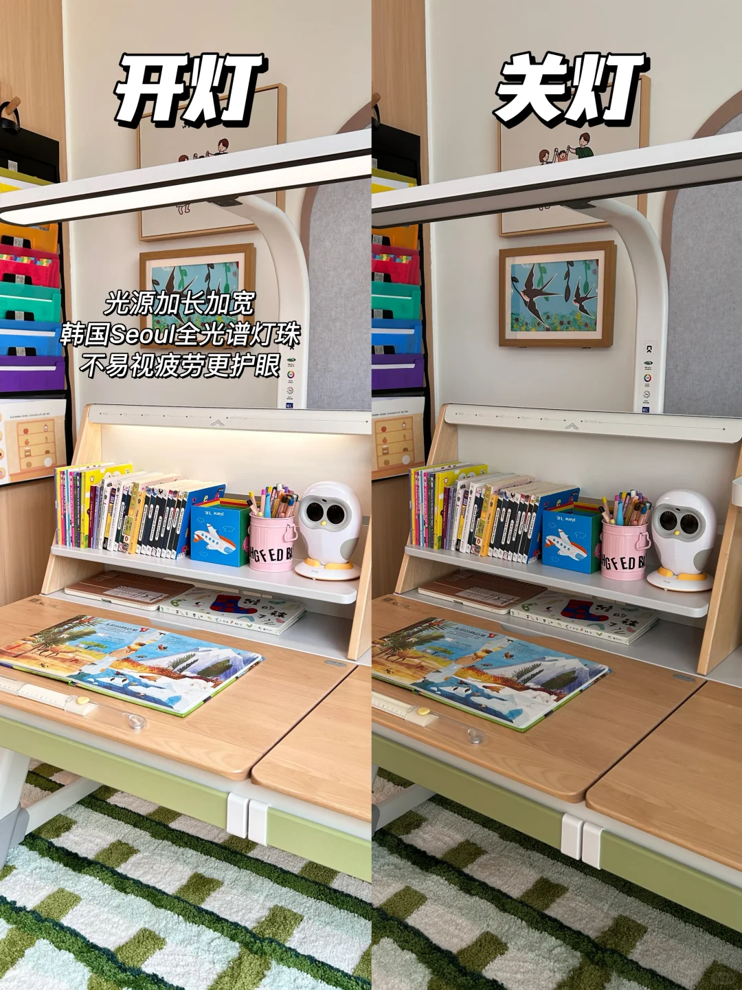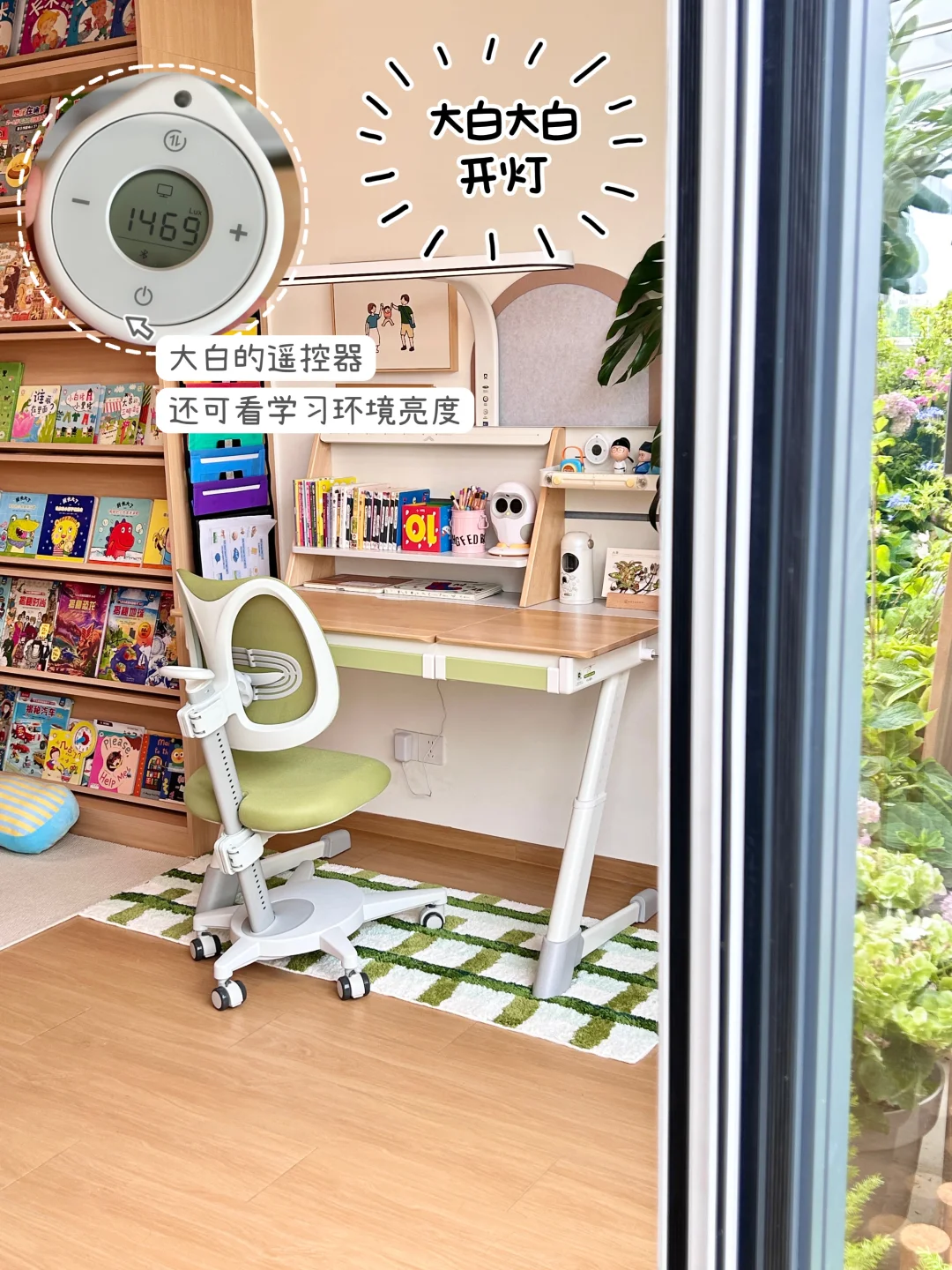 🌞因为家里客厅太长了,这个角落的亮度也不太够,所以一起配置了大白护眼灯夹式款,灯光加长加宽,可以均匀照亮整个桌面,这种无光差的光环境不容易让孩子视疲劳,更护眼!而且是声控+遥控器+触控的,日常学习往椅子上一坐,也不用联网,张张嘴按按键护眼光就有啦。