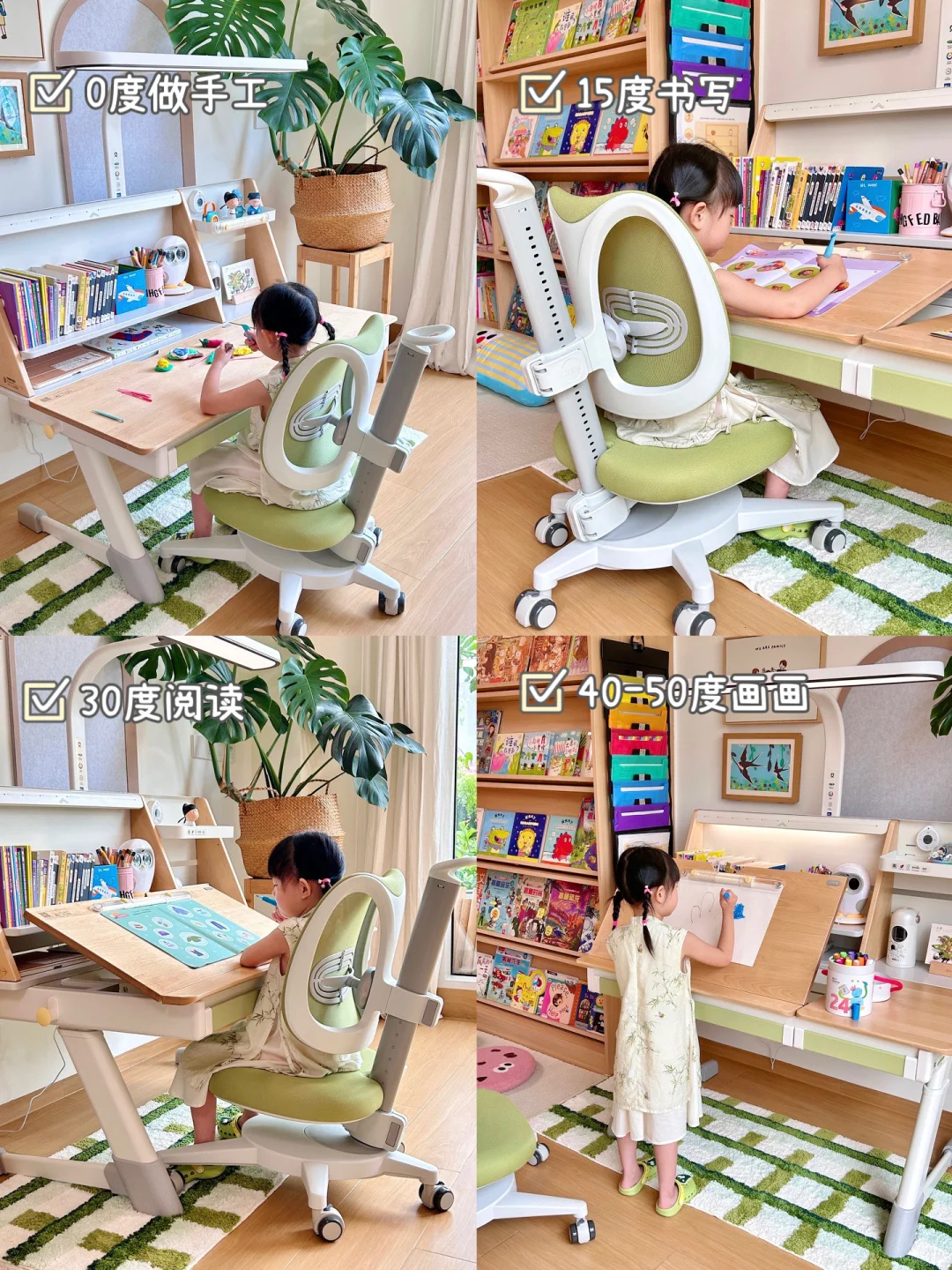 桌板角度还可以根据学习情况来调节!0度做手工,15度书写✍,30度阅读,40-50度画画🎨刚刚好!