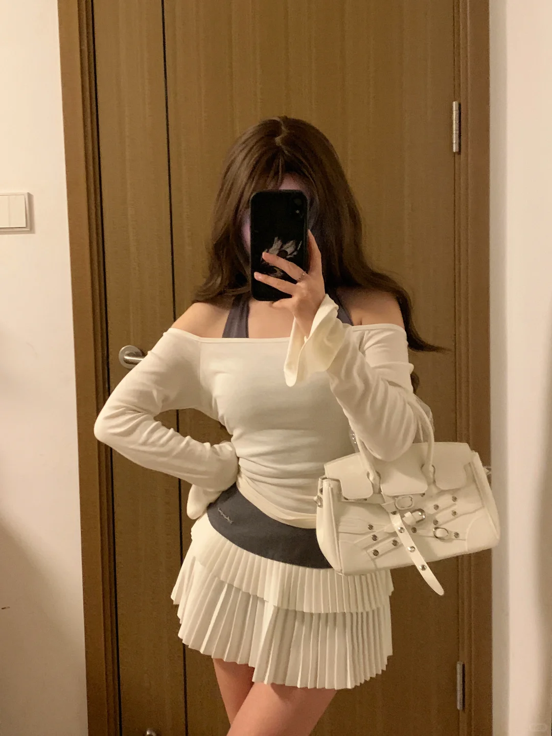 喇叭袖一字肩上衣➕美式复古设计感拼接蛋糕裙 这一套好好看呀 上身就是美式复古辣妹!!!
