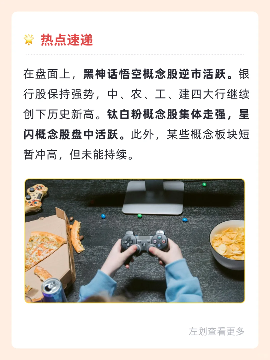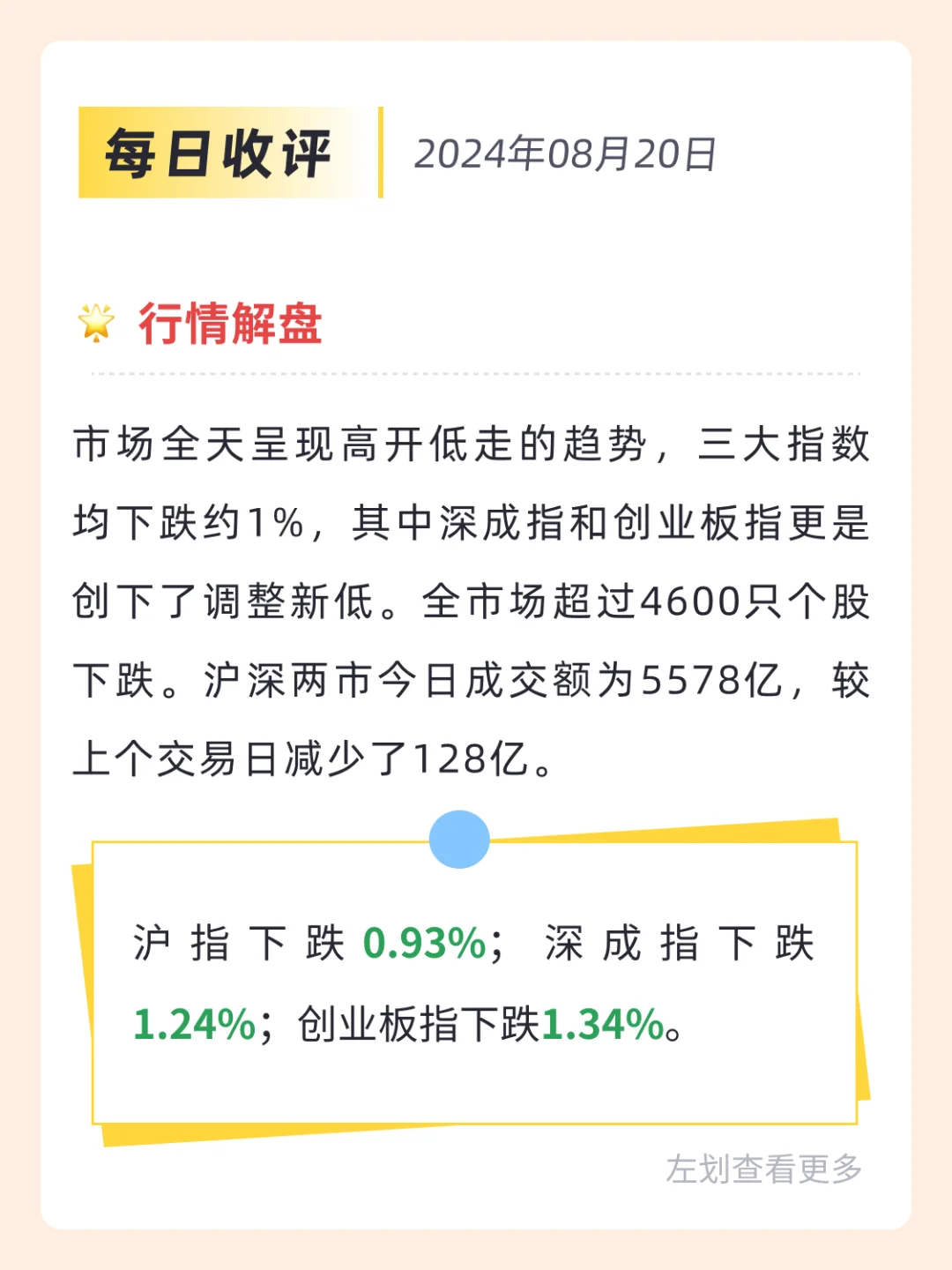 1⃣️ 行情解盘 👉 市场全天呈现高开低走的趋势,三大指数均下跌约1%,其中深成指和创业板指更是创下了调整新低。 👉沪指下跌0.93%;深成指下跌1.24%;创业板指下跌1.34%。 👉全市场超过4600只个股下跌。沪深两市今日成交额为5578亿,较上个交易日减少了128亿。 2⃣️ 热点速递 👉在盘面上,黑神话悟空概念股逆市活跃。银行股保持强势,中、农、工、建四大行创下历史新高。 👉钛白粉概念股集体走强,星闪概念股盘中活跃。 👉在下跌方面,轨交概念股跌幅居前;煤炭股集体调整。