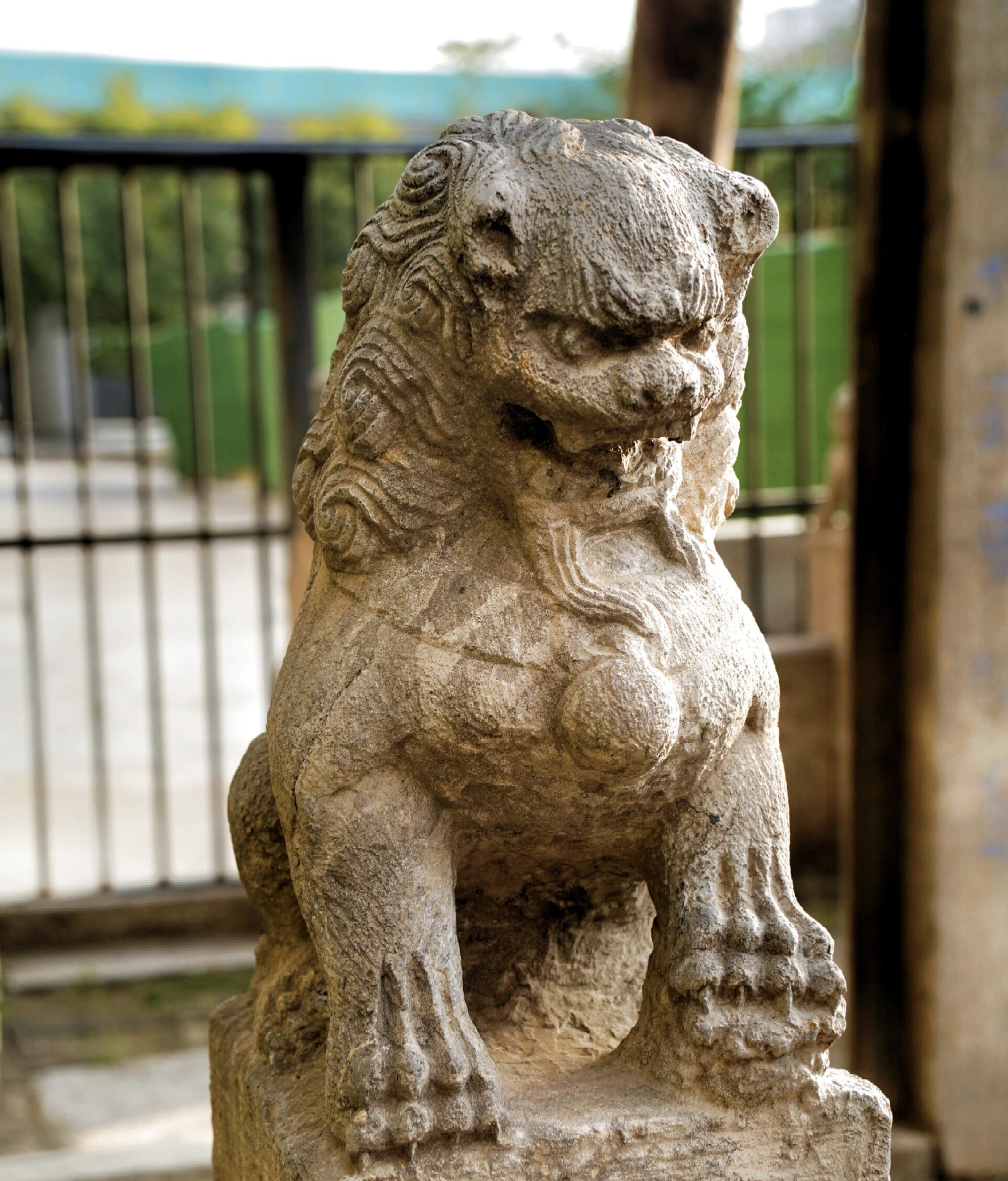 牌楼两侧的石狮,同样生动形象。它们蹲坐在基座之上,身体微微前倾,双目圆睁,仿佛在警惕地注视着四周。狮鬃浓密卷曲,雕刻得丝丝分明;利爪紧紧按在绣球或幼狮之上,尽显威严与力量。这些石狮不仅是守护的象征,更是明代石雕艺术的杰出代表。