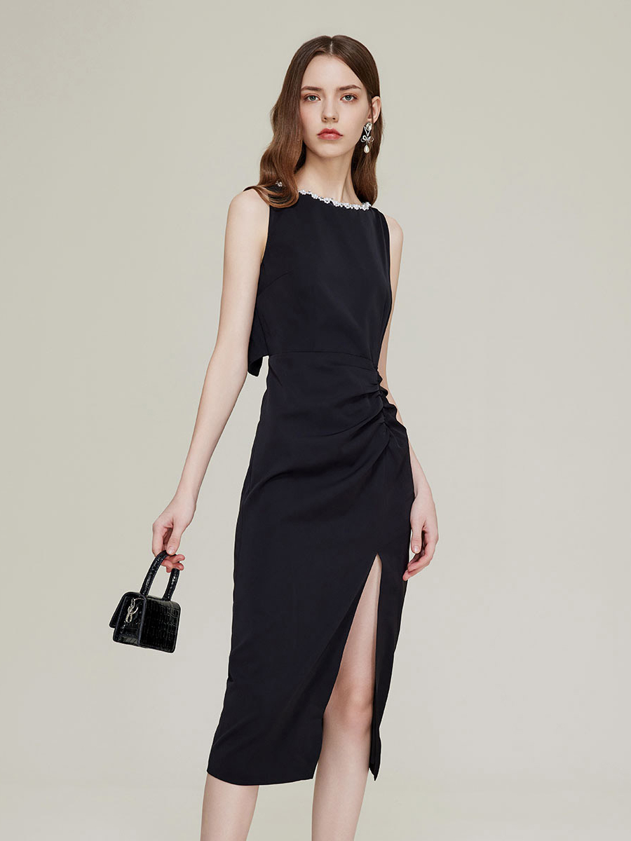 项链般珍珠圆领精致,处处显优雅名媛气质;结合后背纽扣开叉设计,打破单一更显优雅气质