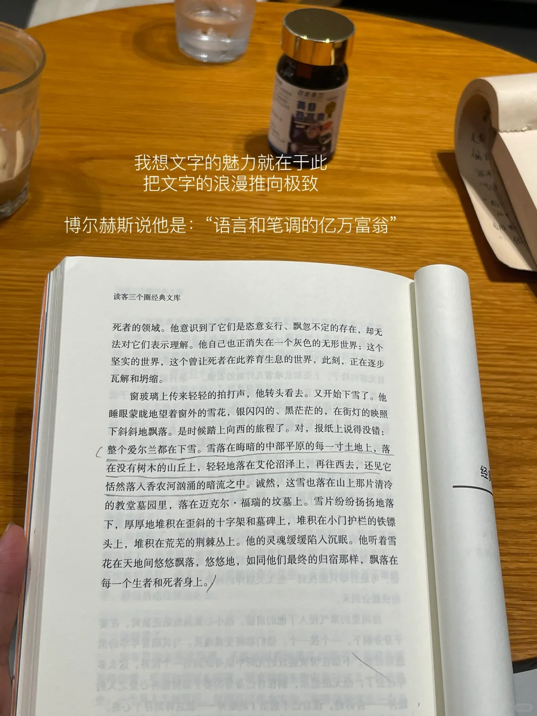 看起来轻轻巧巧,却几句话就勾勒出一个氛围感的场景,就像在看一部爱尔兰雪夜的文艺片。
