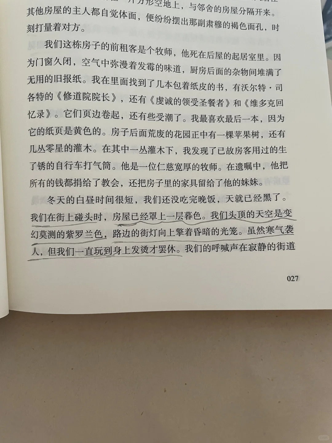“路上的街灯向上擎着昏暗的光芒,虽然寒气袭人,但我们一直玩到身上发烫才罢休。”