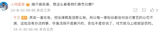 于正回复网友质疑“是否在为白鹿告黑”评论:“其实一直在告,但法律就是没那么快,所以每一家粉丝都会对自己爱豆的公司不满,这也没有办法的事,毕竟法院不是我开的,告也不是你说了,对方就马上收到惩罚的。”