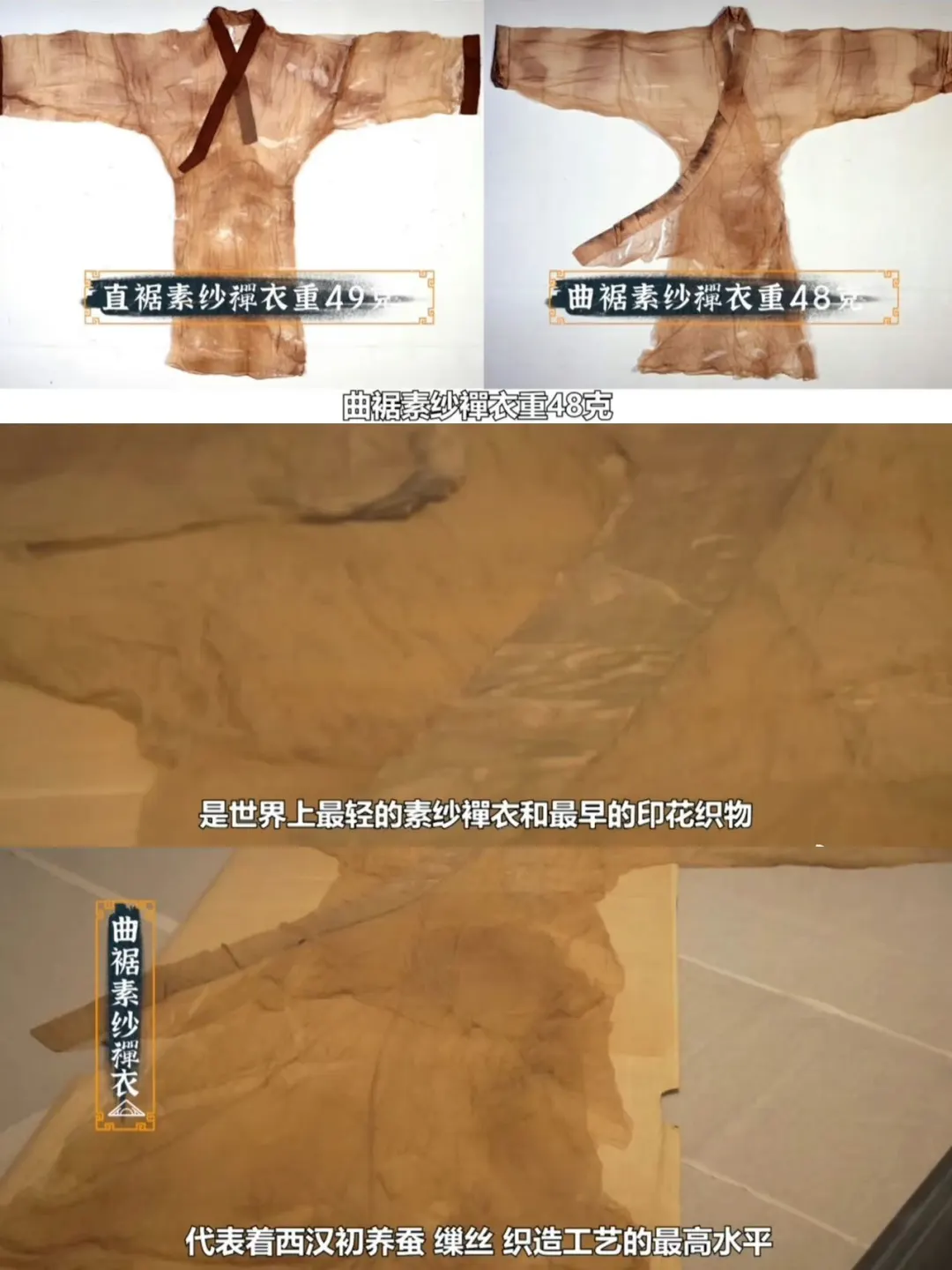❗️最震撼的就是马王堆出土的素纱单衣!美哭我了!这是世界上最轻的一件衣服,分量仅49克,折叠起来能放进一个火柴盒之中,并且从纹样细节到色泽光彩太美了!更让人难以置信的是这居然是2000多年前的制作工艺与时代审美😭我的天!此刻真的热泪盈眶了!