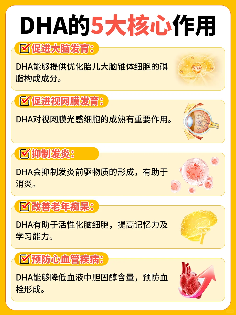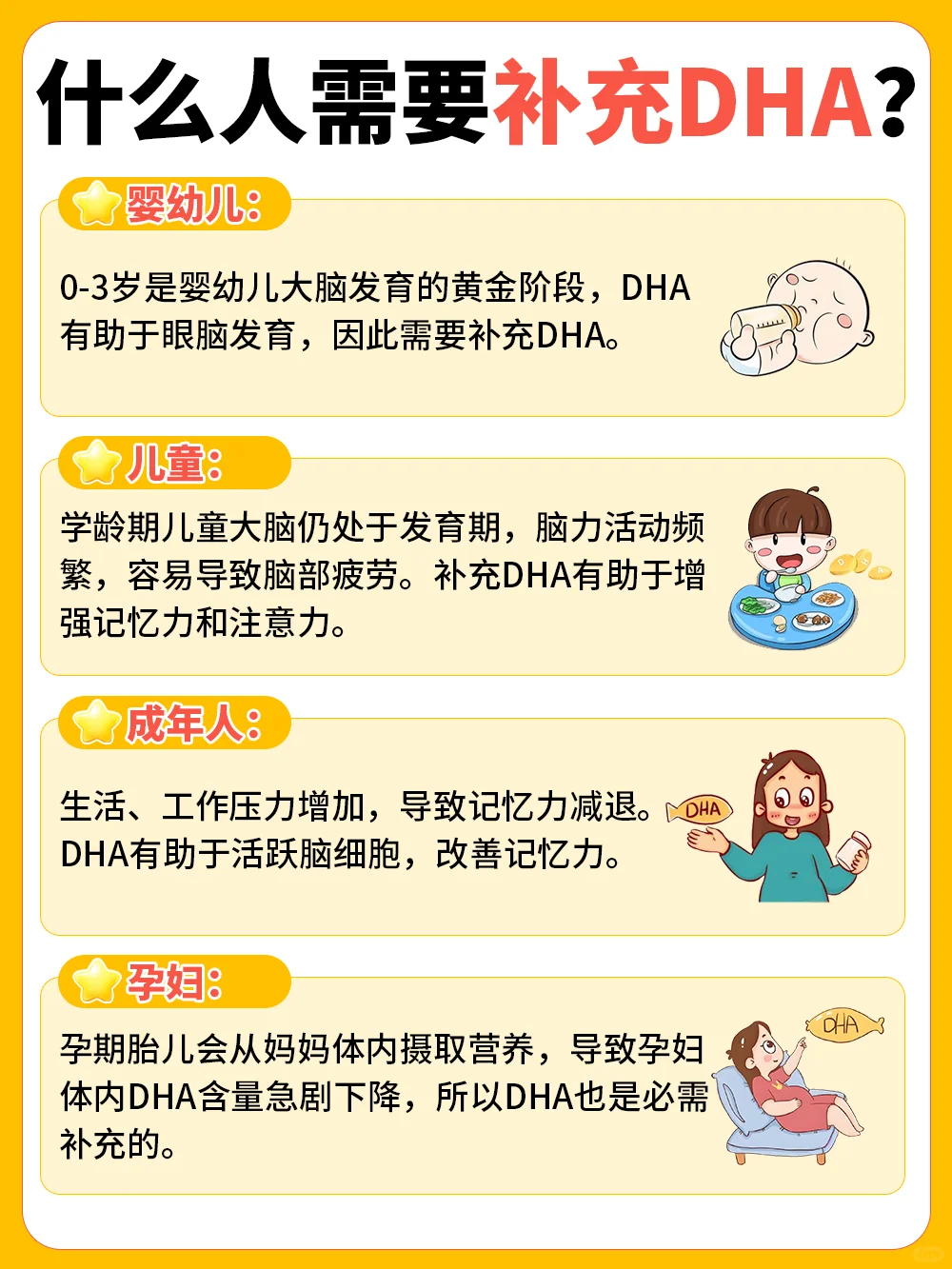 那DHA到底有啥用呢?简单说啊,DHA对🧠和👀的发育非常重要。对于⬆️记忆力、专注力也有帮助,选DHA的时候呢,要注意选来源好、纯度高的产品,这样效果才好。(具体看图哦)